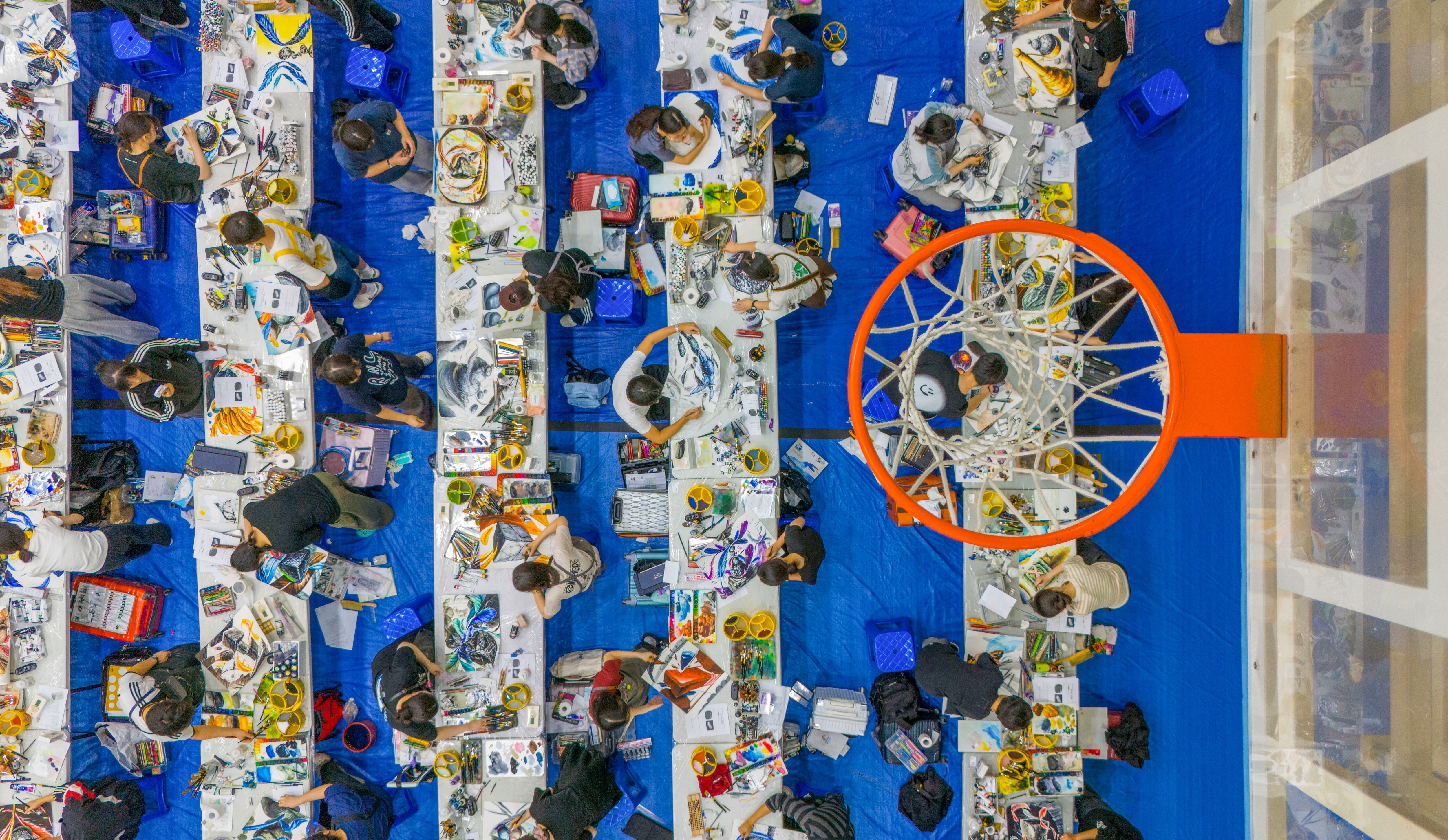 Students are drawing pictures at the “2025 National High School Art and Design Competition” held at the Samyuk University Gymnasium in Nowon-gu, Seoul on the afternoon of the June 19, 2025. The students were filmed by hanging a basketball goal with a drone. (Photo by Jang Yeon-seong)