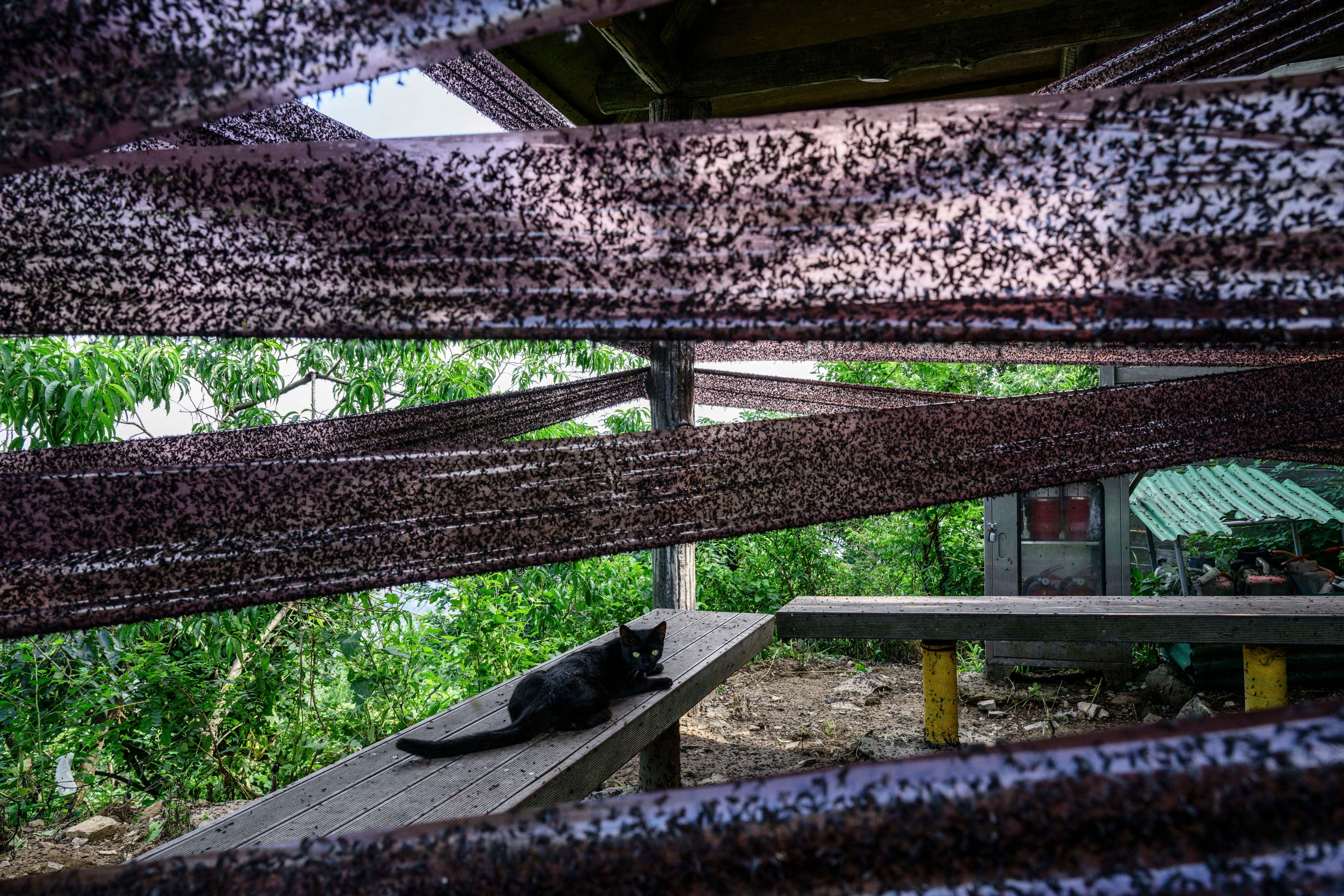 A black cat rests amongst sticky traps used to catch lovebugs or Plecia nearctica at Mount Gyeyang summit in Incheon on July 3, 2025. (Photo by Anthony Wallace/AFP Photo)