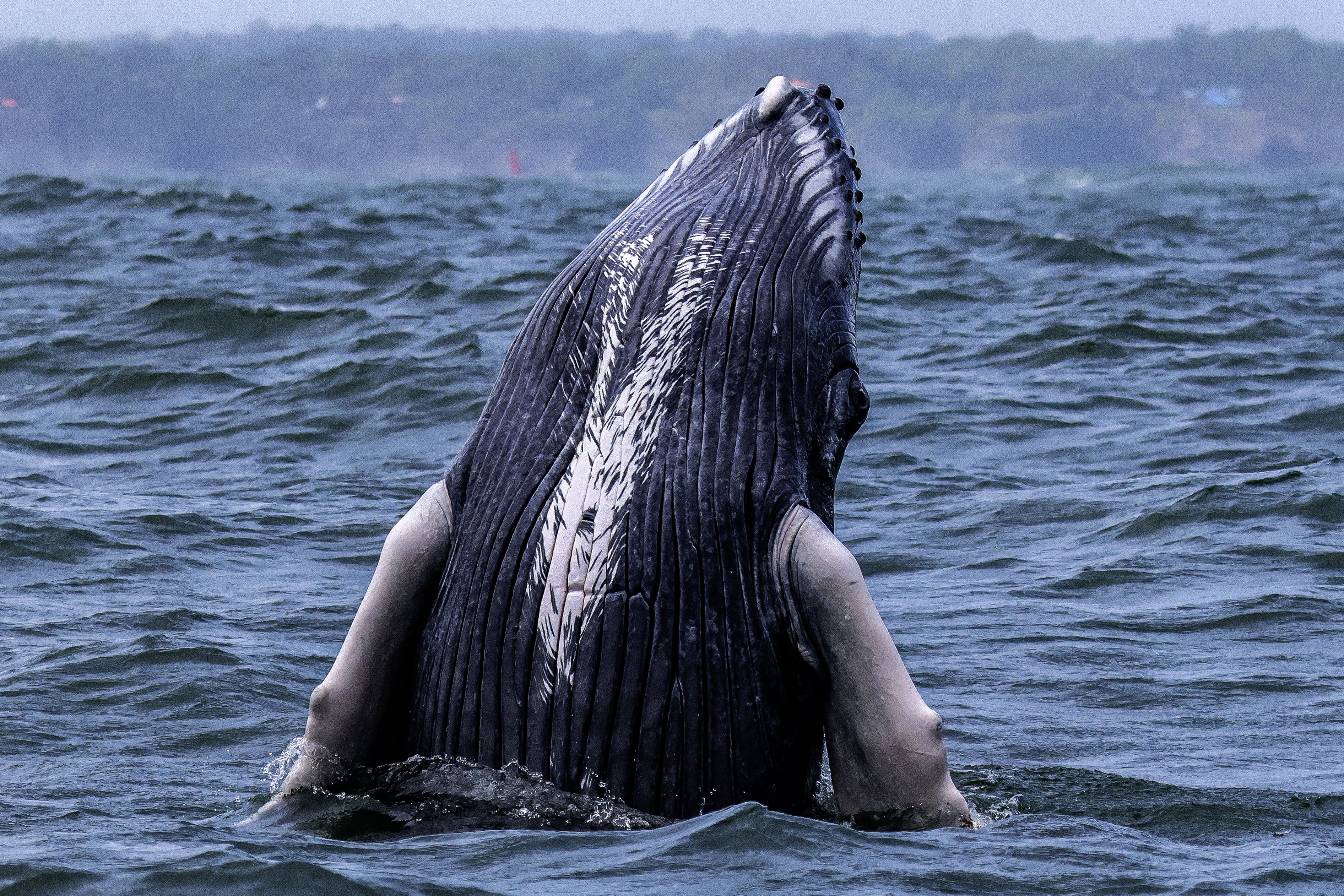 A humpback whale leaps in the waters of the Pacific Ocean at Bahia Malaga Natural Park, Colombia, on August 29, 2025. Every year, between June and November, humpback whales undertake seasonal migration from the Antarctic Peninsula to the equatorial coast of Colombia to breed, feed, and rest. (Photo by Iusef Samir Rojas/AFP Photo)