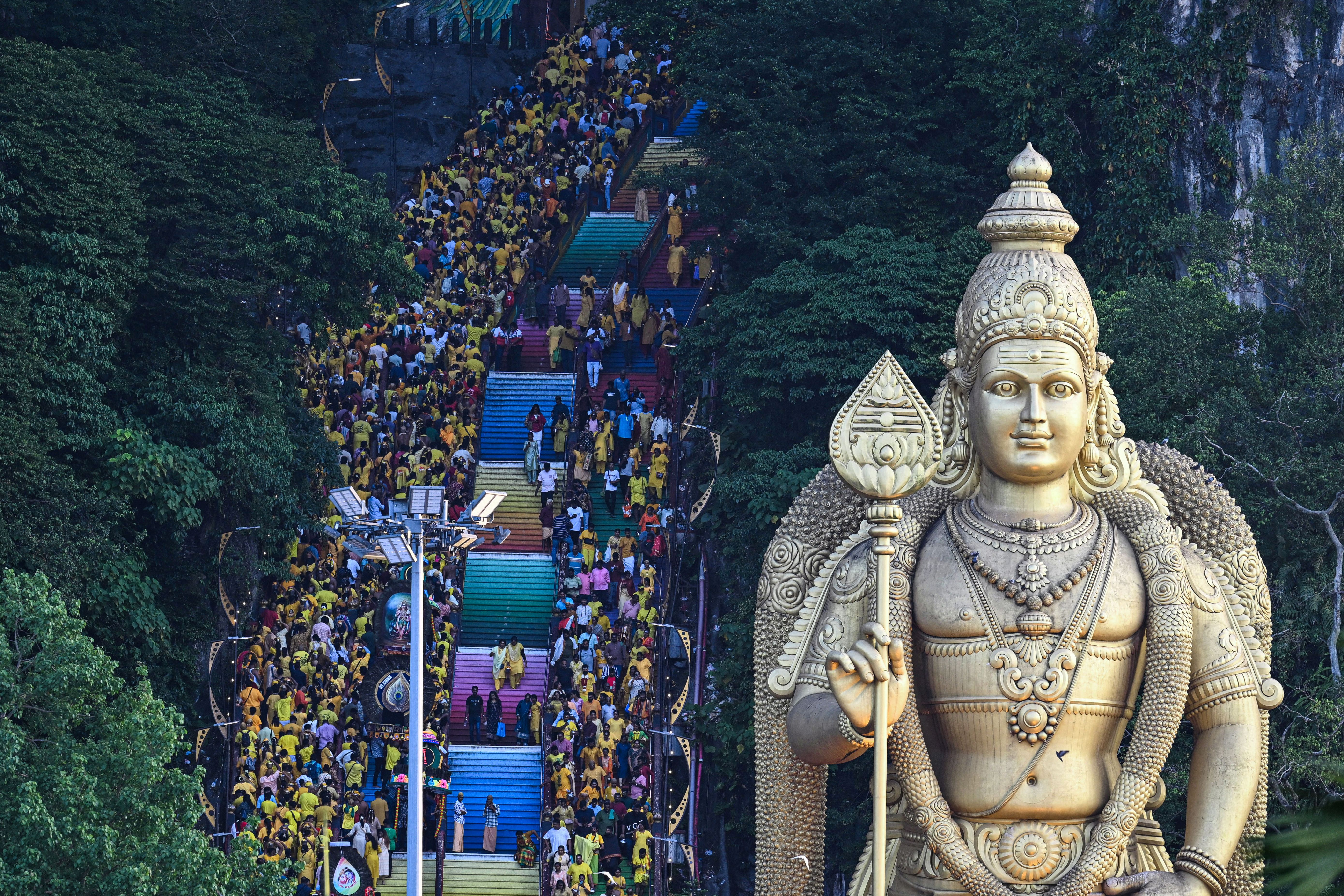 Hindu devotees climb the 272 steps to the Batu Caves temple to make offerings during the Thaipusam festival at Batu Caves on the outskirts of Kuala Lumpur on February 11, 2025. Hundreds of thousands ethnic Indian Malaysians gathered in temples across the country to celebrate the Thaipusam religious festival on February 11, with many piercing their bodies with hooks and skewers in acts of devotion. (Photo by Mohd Rasfan/AFP Photo)