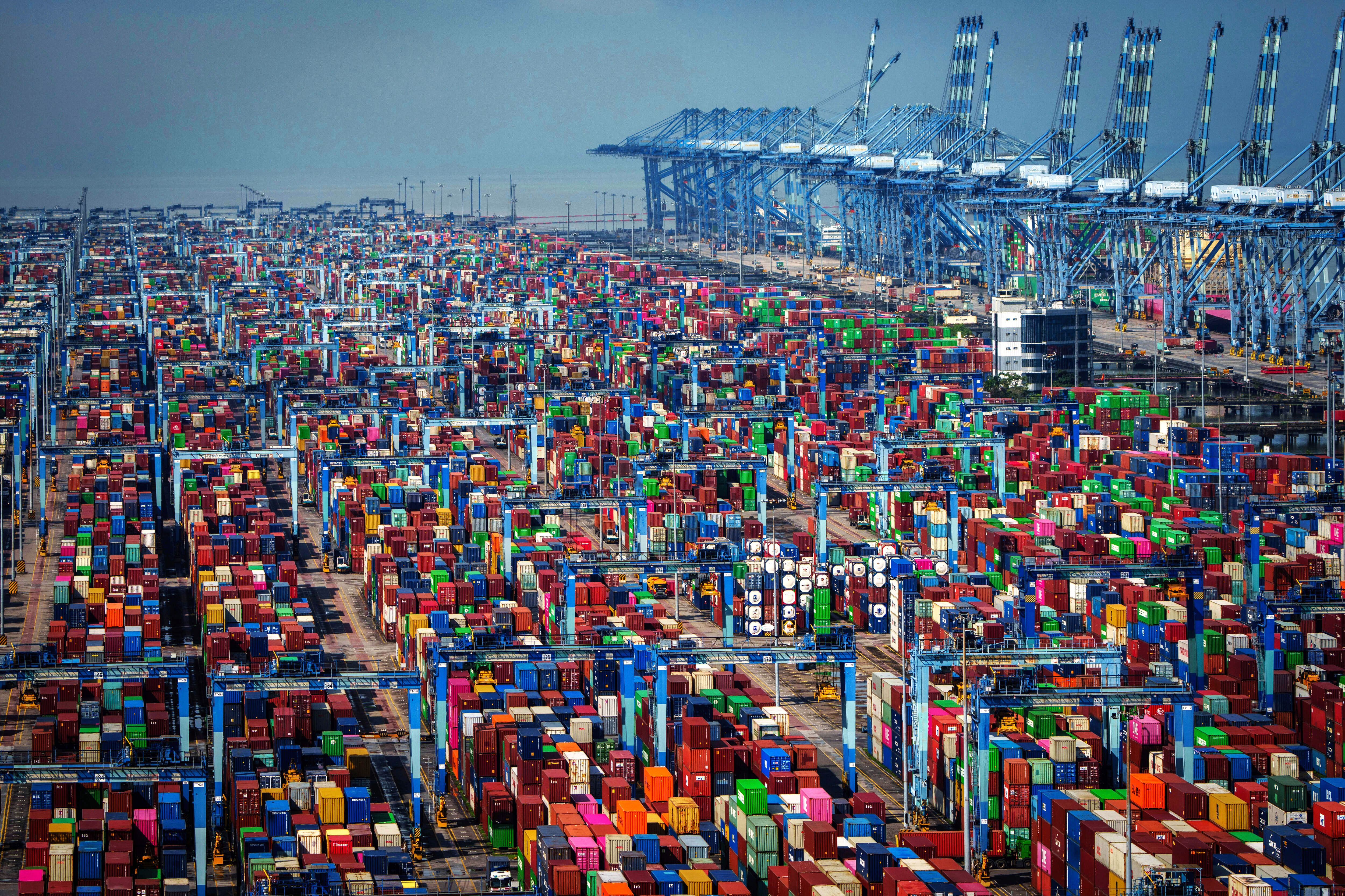 Shipping containers are stacked at Westport in Klang on the outskirts of Kuala Lumpur, Malaysia, Friday, April 18, 2025. (Photo by Vincent Thian/AP Photo)