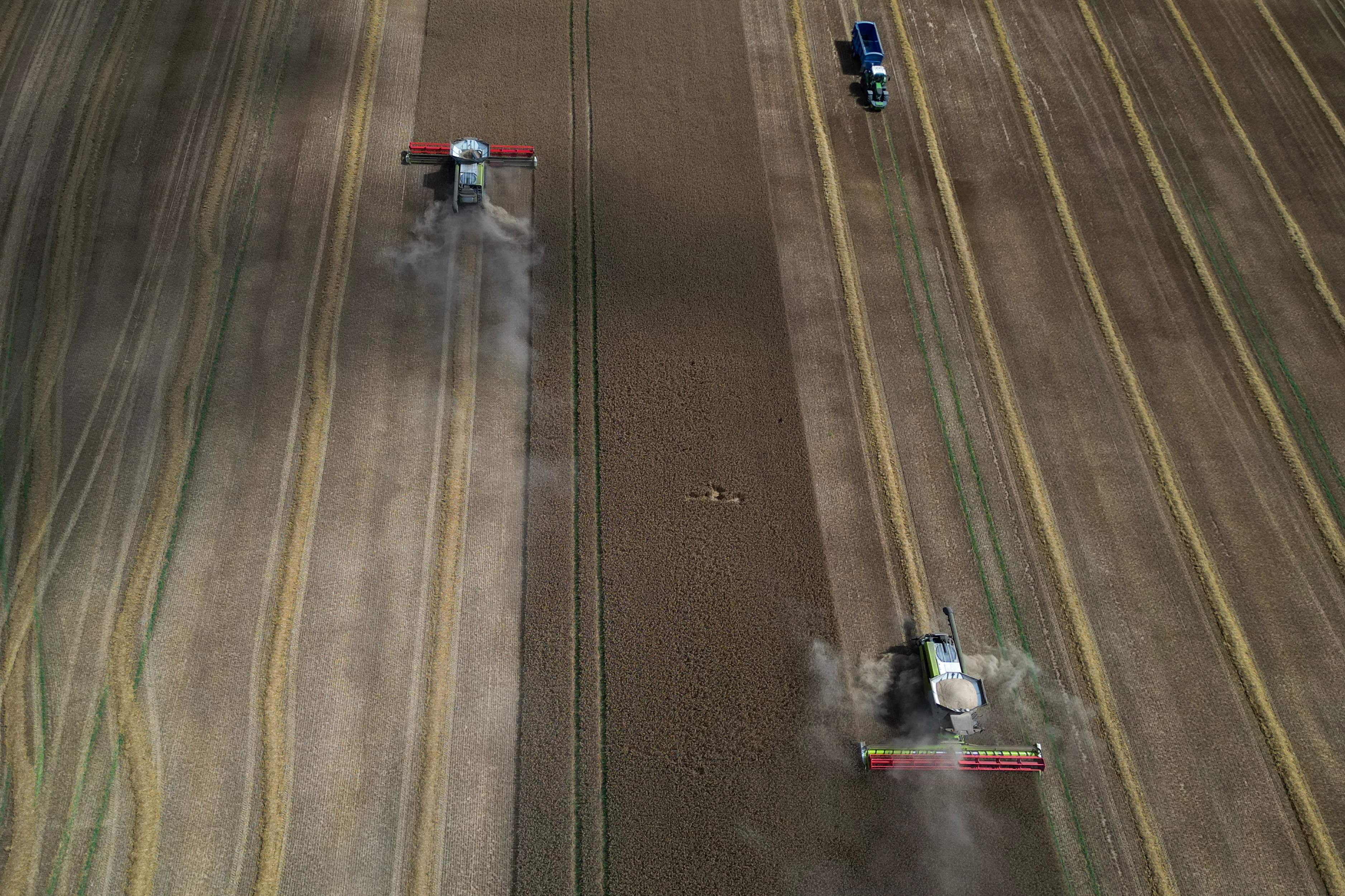 An aerial photograph shows a wheat harvest near Betteshanger, south-east England, on August 17, 2025. Excepionally dry weather has seen a reduced yeald in this seasons wheat harvest. (Photo by Ben Stansall/AFP Photo)