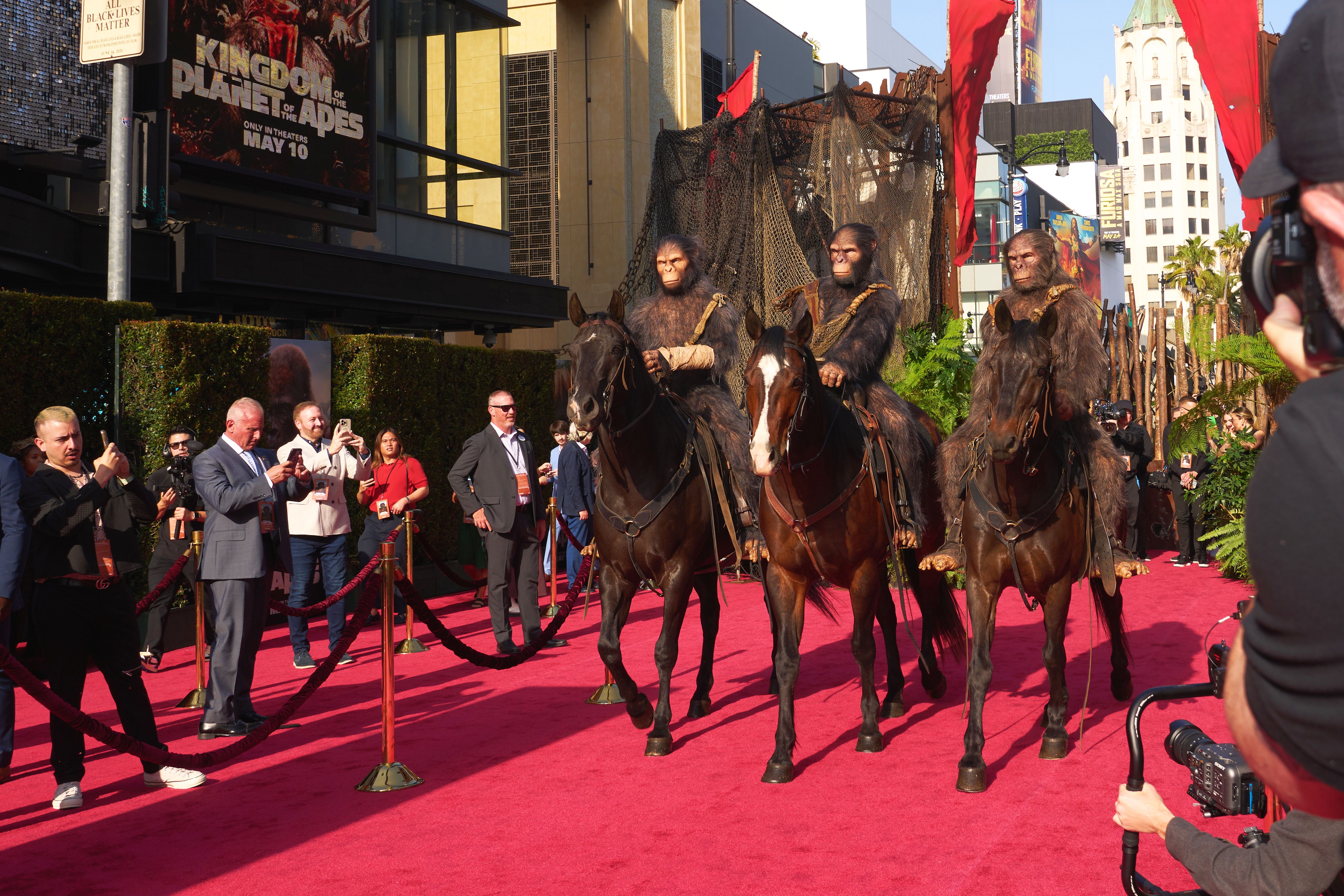 People in ape costumes ride horses at the “Kingdom of the Planet of the Apes” premiere at TCL Chinese Theatre in Los Angeles, California, USA, 02 May 2024. (Photo by Allison Dinner/EPA)