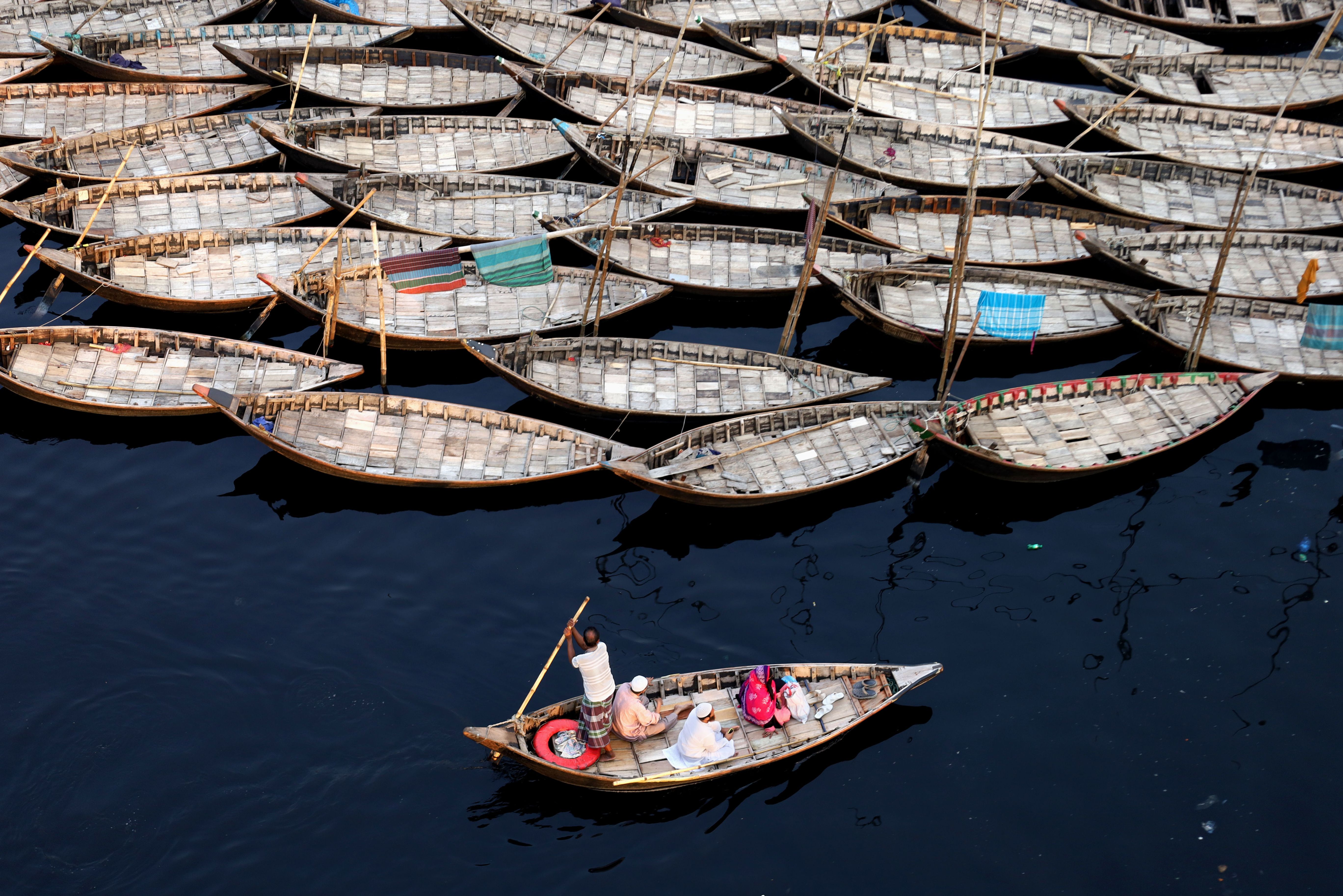 Amid the polluted, bluish waters of the Buriganga River at Sadarghat in Old Dhaka, boatmen navigate small wooden boats, ferrying passengers past hundreds of anchored boats on April 8, 2025. (Photo by Syed Mahabubul Kader/ZUMA Press Wire/Rex Features/Shutterstock)