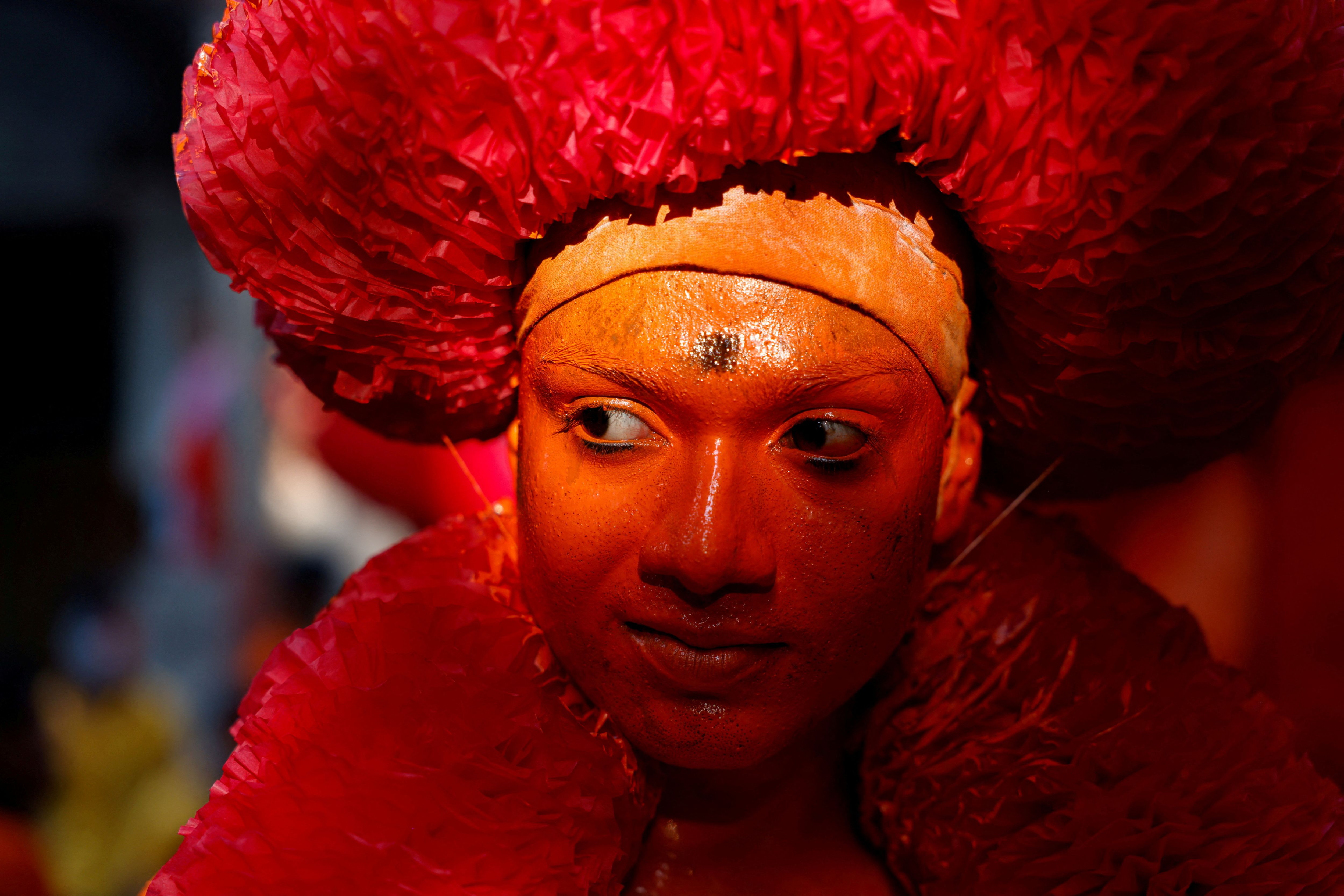 A Hindu devotee looks on after applying paint to his body to celebrate the Lal Kach festival in Munshiganj, Bangladesh, on April 13, 2025. (Photo by Mohammad Ponir Hossain/Reuters)