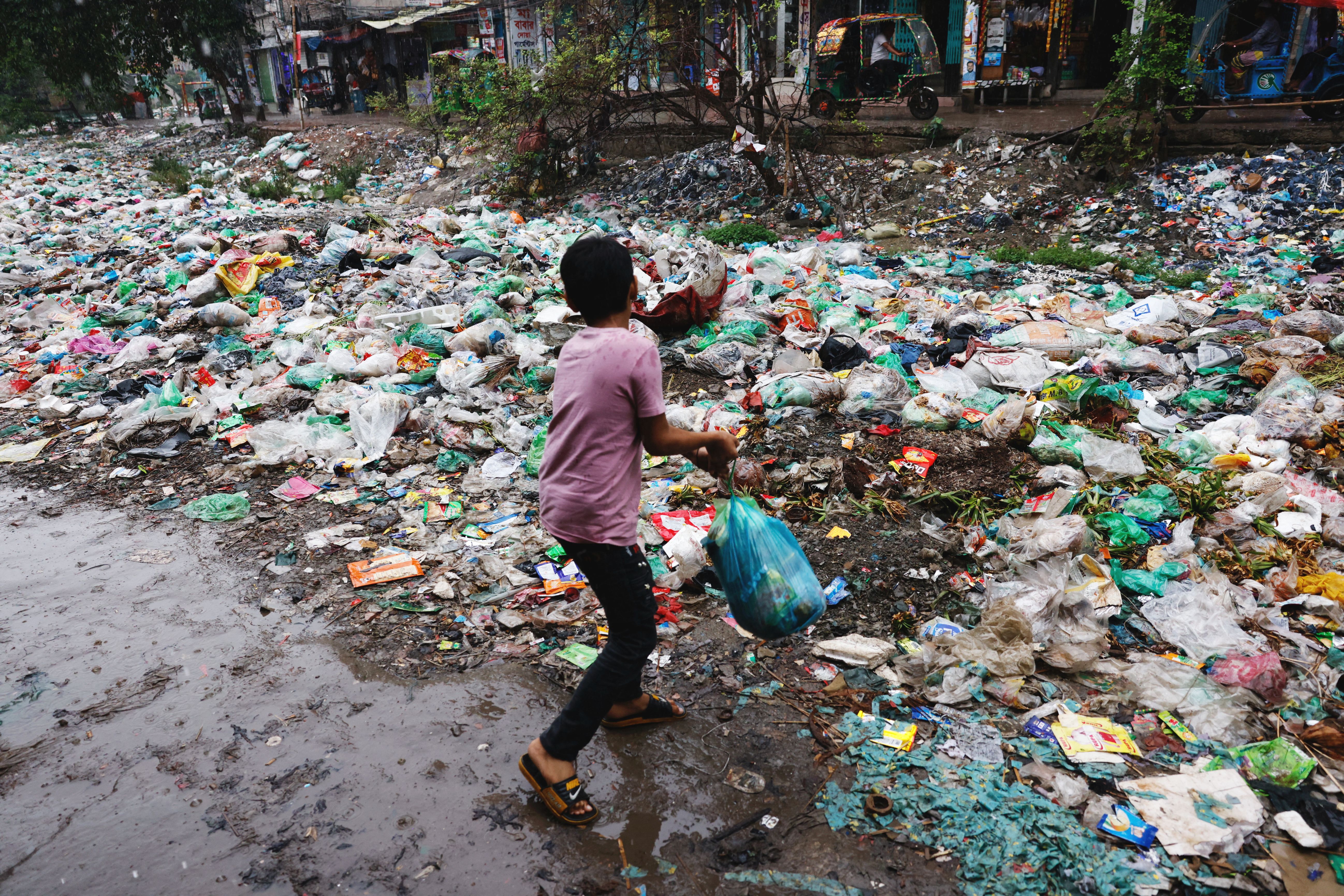 A boy throws a polythene bag full of waste into Shuvadda Canal which is under the pile of plastic waste, in Dhaka, Bangladesh on May 20, 2025. (Photo by Mohammad Ponir Hossain/Reuters)