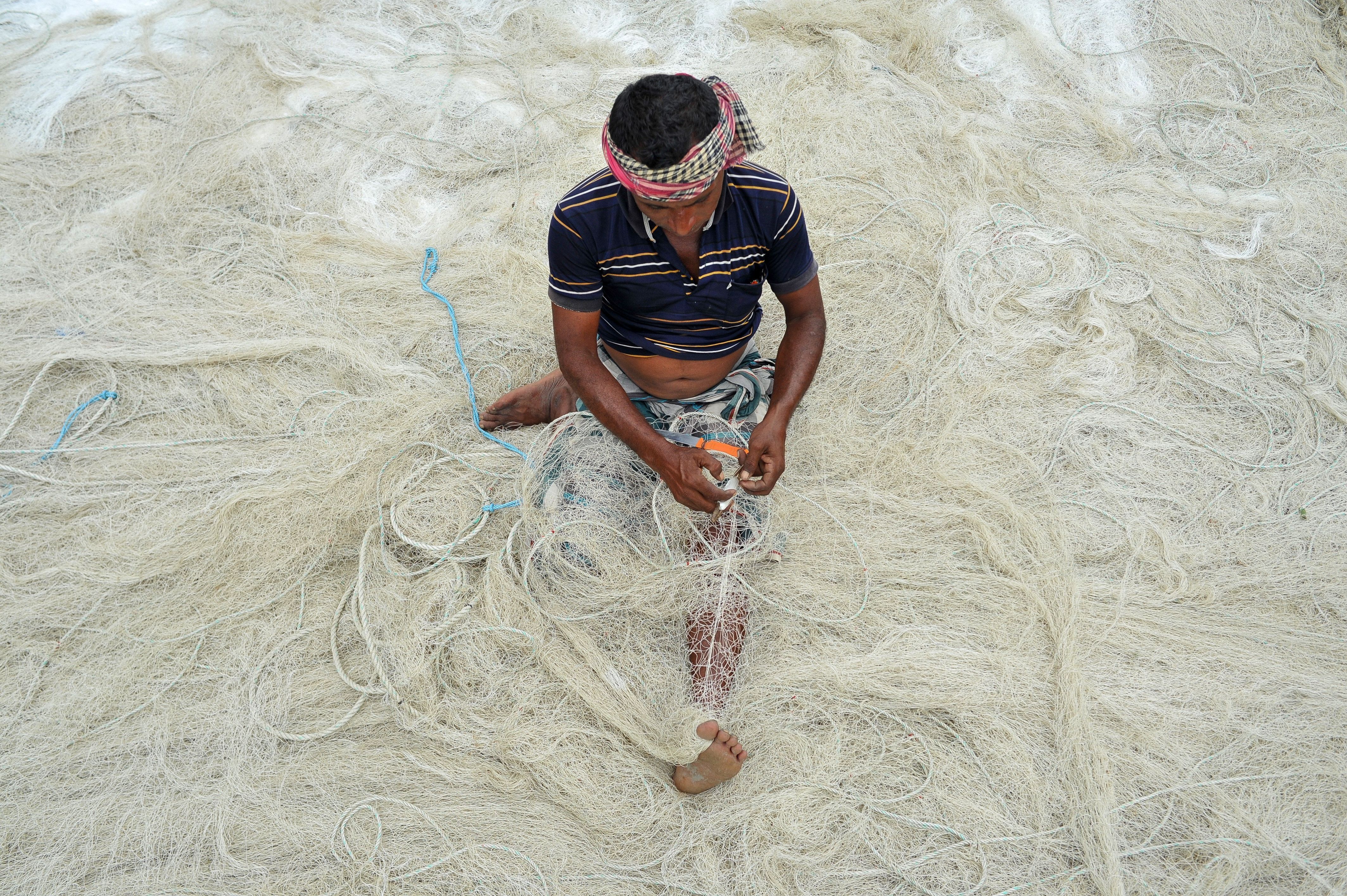 Fishermen repair and weave specialized Pocket Nets for catching Hilsa fish on the banks of the Karnaphuli River in the city Chittagong, Bangladesh on June 30, 2025. Bangladeshi fishermen have been busy since June 11 after withdrawn of the government imposed a 58-day ban on hilsa breeding and protecting marine biodiversity. (Photo by Md Rafayat Haque Khan/ZUMA Press Wire/Rex Features/Shutterstock)