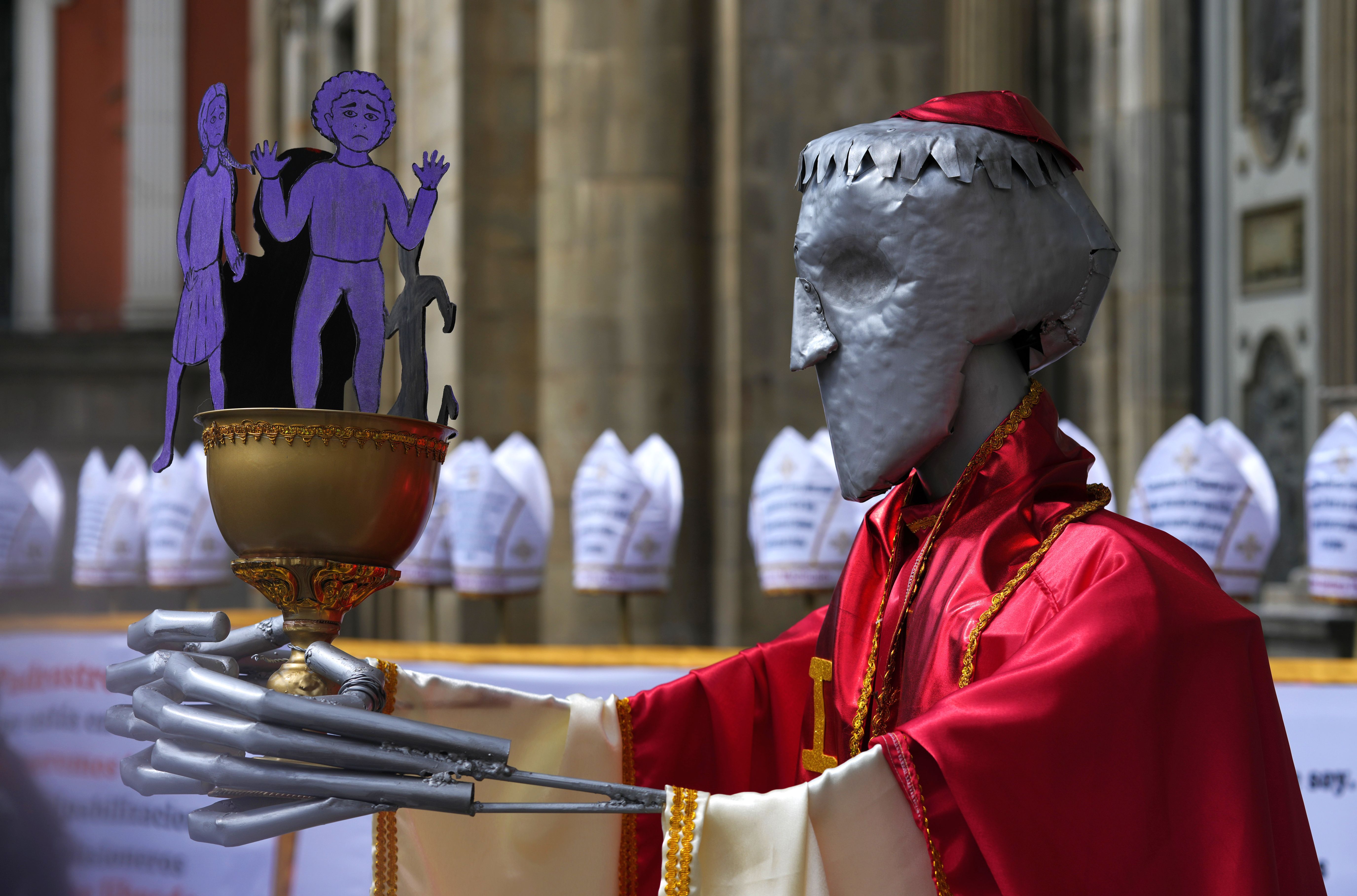 A sculpture representing a Catholic priest and a chalice filled with cutouts of children stands alongside bishop mitres with messages regarding pedophile priests, during a protest organized by the Mujeres Creando feminist association who are demanding the convictions of the priests accused of sexually abusing minors, outside the Metropolitan Cathedral in La Paz, Bolivia, May 16, 2024. (Photo by Juan Karita/AP Photo)