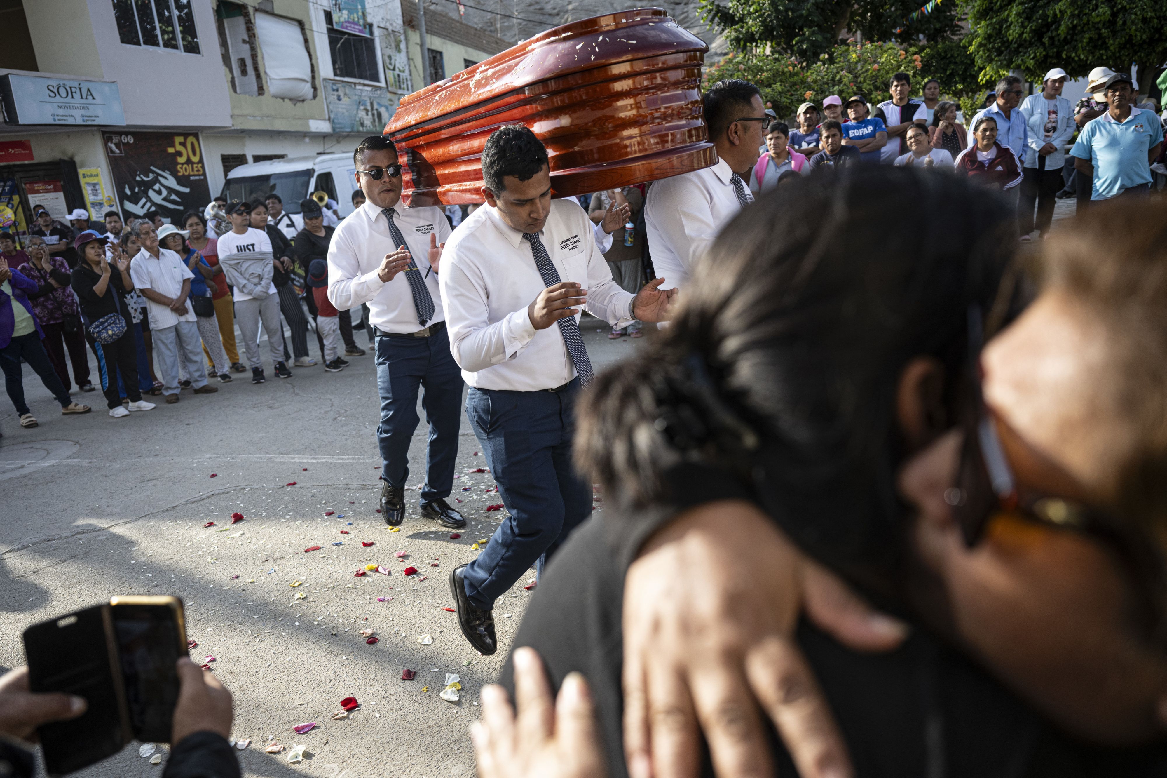 Funeral bearers dance while holding the coffin with the remains of Florentino Jamanca during his funeral in the agricultural town of Humaya in the city of Huacho, about 148 km north of Lima, Peru on May 2, 2024. Some funeral companies began offering this service eight years ago, taking advantage of the fact that in several rural parts of Peru, the farewell to the dead is usually more festive than solemn, explains Alex Canales, director of the company Cargadores Fúnebres de Huacho, one of the pioneers of the business. (Photo by Ernesto Benavides/AFP Photo)