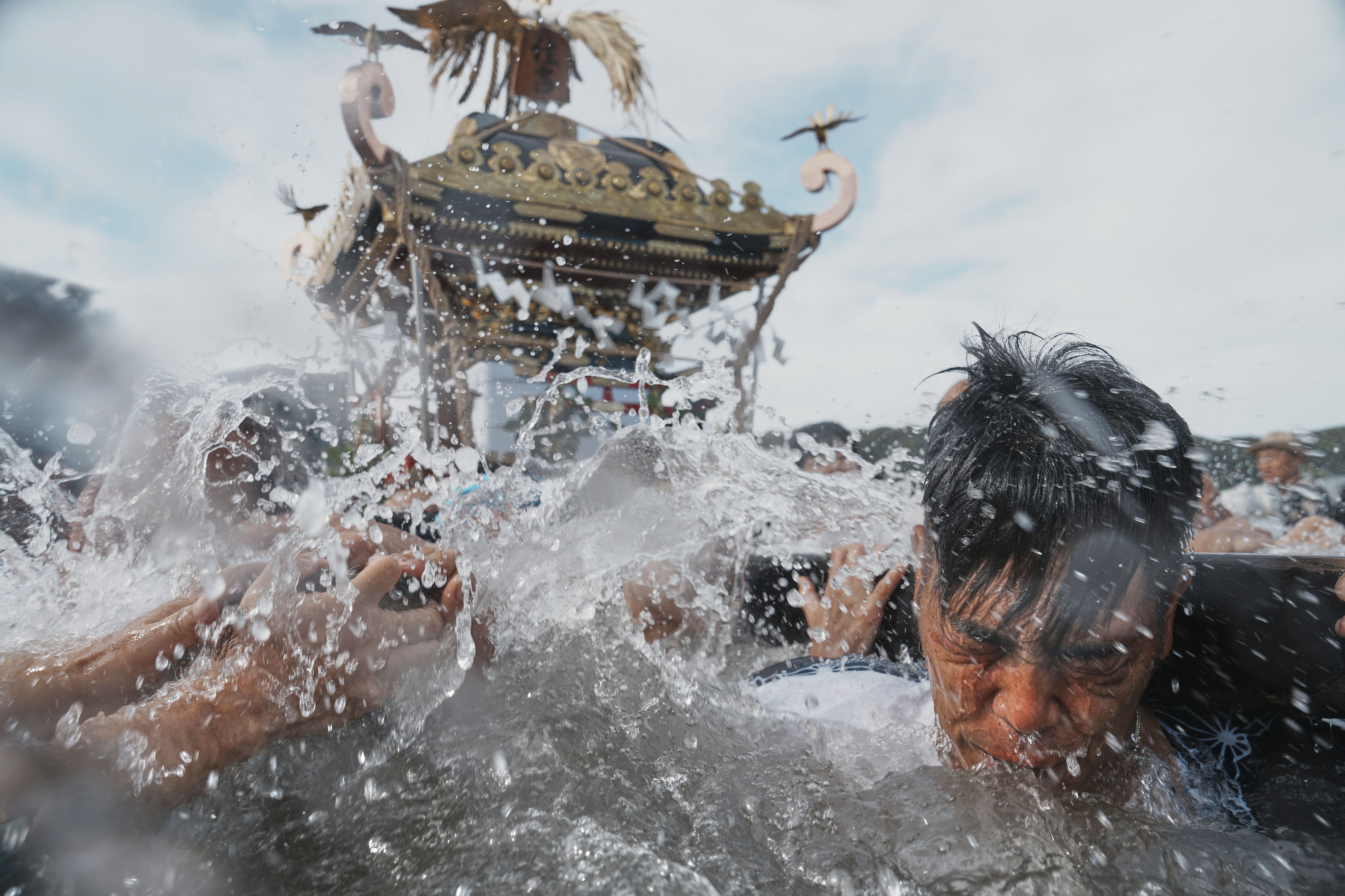Participants carry a portable shrine, or mikoshi, into the sea during a purification rite at the annual Kurihama Sumiyoshi Shrine Festival at Kurihama, Yokosuka city, south of Tokyo Sunday, July 27, 2025. (Photo by Eugene Hoshiko/AP Photo)