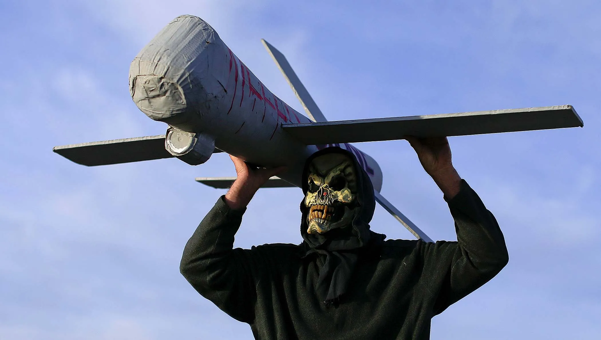 John Amidon holds up a model of an Air Force drone while protesting outside Creech Air Force Base in Indian Springs, Nevada, on March 27, 2013. Amidon is part of the Nevada Desert Experience group which holds an annual peace walk protesting the use of drones and nuclear weapons. The walk, which lasts five days, starts from Las Vegas, makes a stop at Creech Air Force Base and ends at the Nevada National Security Site in Mercury, Nevada. (Photo by Julie Jacobson/Associated Press)