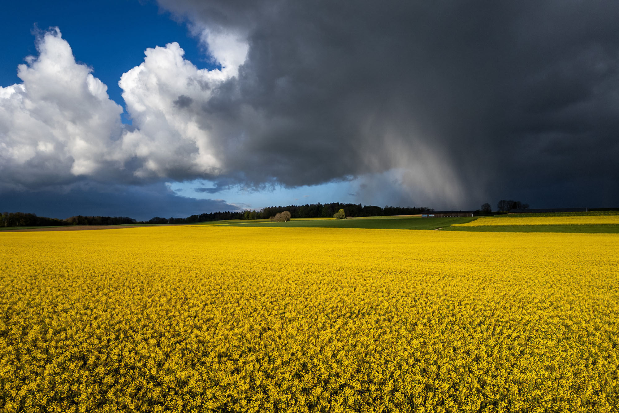This aerial photograph taken on April 18, 2024 near Daillens shows a rapeseed field under heavy sky and rain as Switzerland braces for a cold spell and snow after record-breaking warm temperatures on first half of April. (Photo by Fabrice Coffrini/AFP Photo)