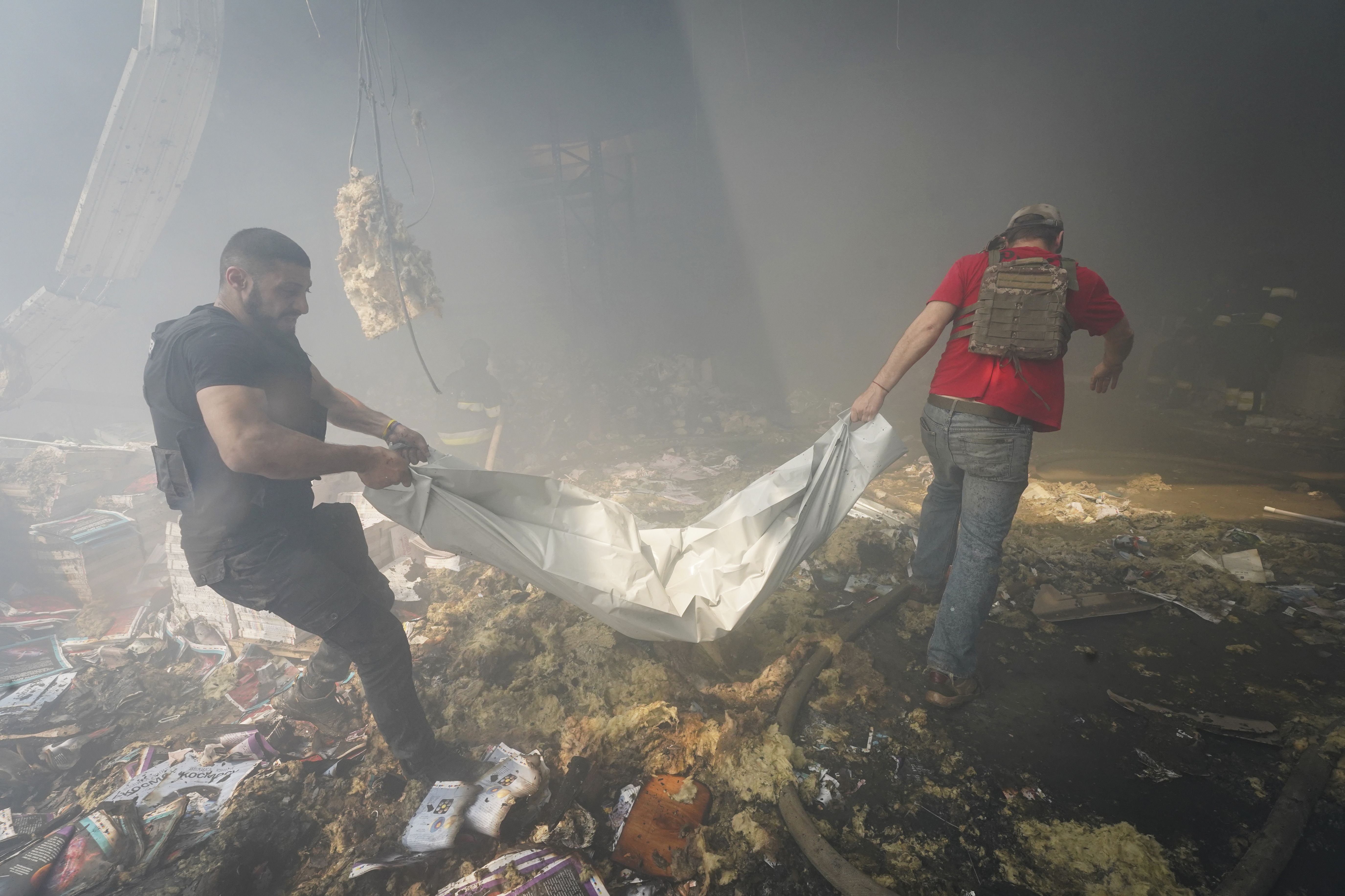Rescuers carry a body after a Russian missile hit a large printing house in Kharkiv, Ukraine, Thursday, May 23, 2024. Russian missiles slammed into Ukraine’s second-largest city in the northeast of the country and killed at least seven civilians early Thursday, officials said, as Kyiv’s army labored to hold off an intense cross-border offensive by the Kremlin’s larger and better-equipped forces. (Photo by Andrii Marienko/AP Photo)