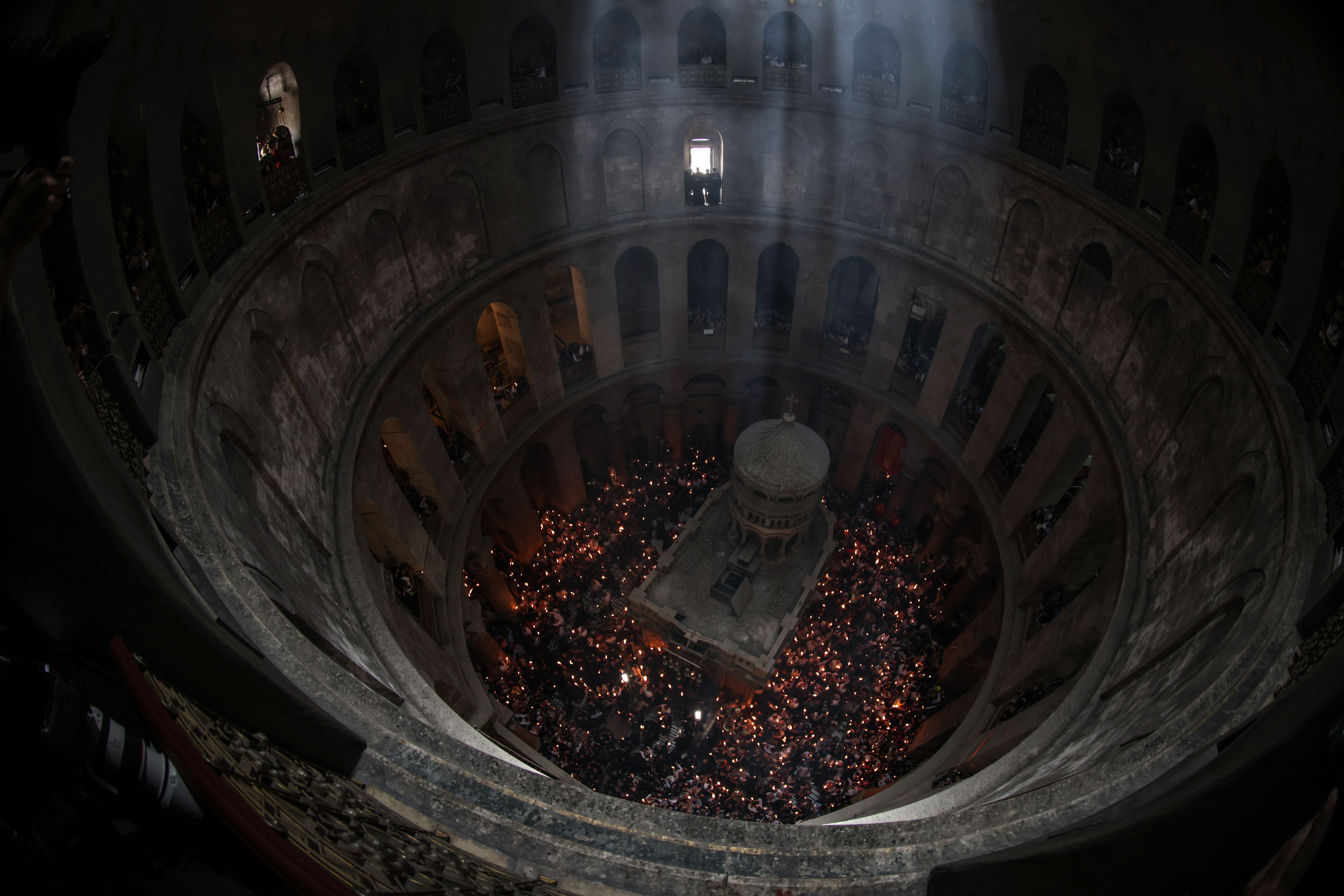 Orthodox Christians gather with lit candles around the Edicule, traditionally believed to be the burial site of Jesus Christ, during the annual Holy Fire ceremony in Jerusalem's Holy Sepulchre church, a day before Orthodox Easter on May 4, 2024. (Photo by Ahmad Gharabli/AFP Photo)