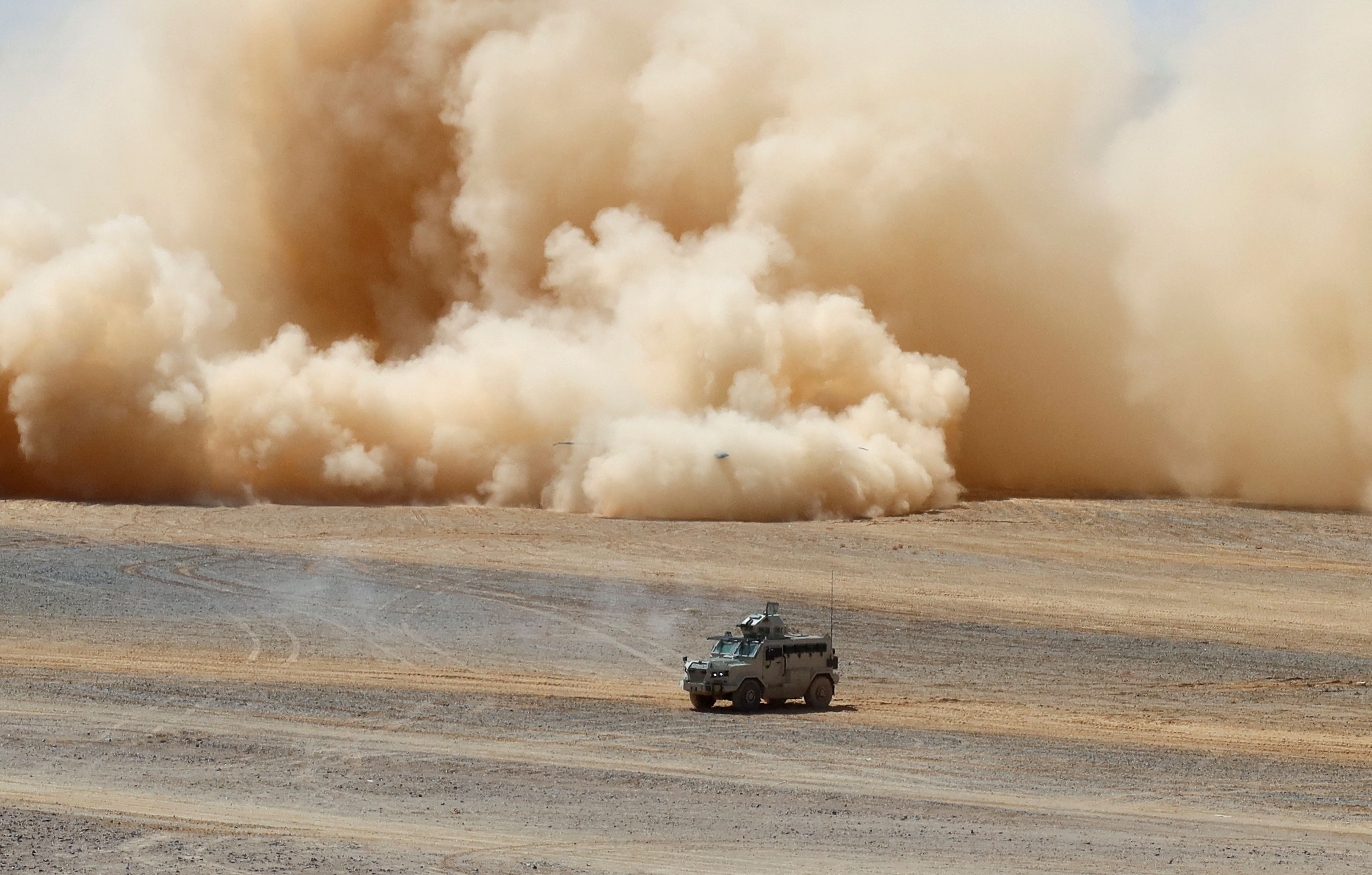 A military vehicle drives during the “Eager Lion” joint military drills with the participation of the Jordanian Armed Forces, the U.S. and other partner countries, in Maan, Jordan on May 23, 2024. (Photo by Jehad Shelbak/Reuters)