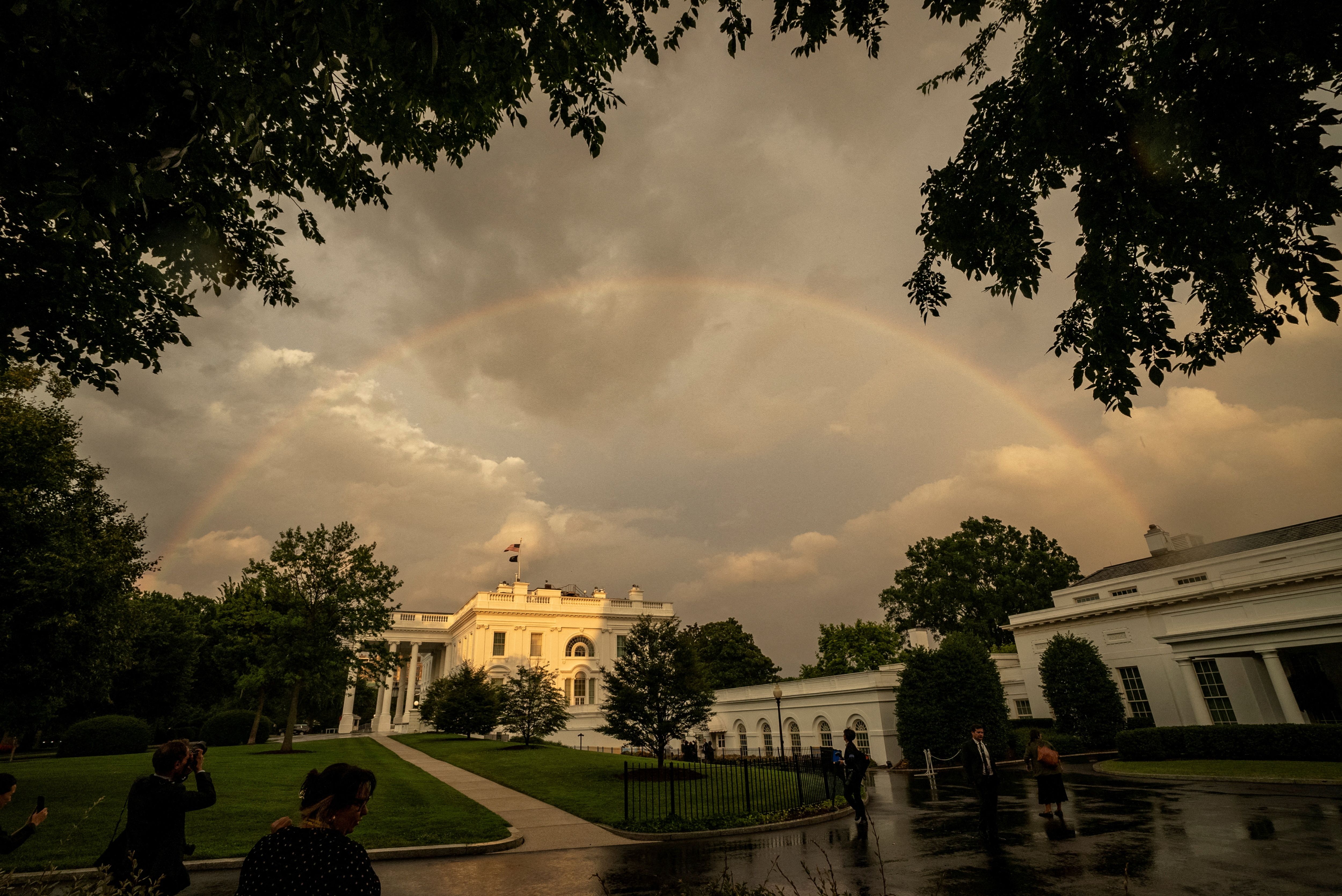 A rainbow fills the sky behind the White House right after U.S. President Joe Biden and first lady Jill Biden greeted NATO allies and partners ahead of a dinner at the White House in Washington on July 11, 2024. (Photo by Ken Cedeno/Reuters)