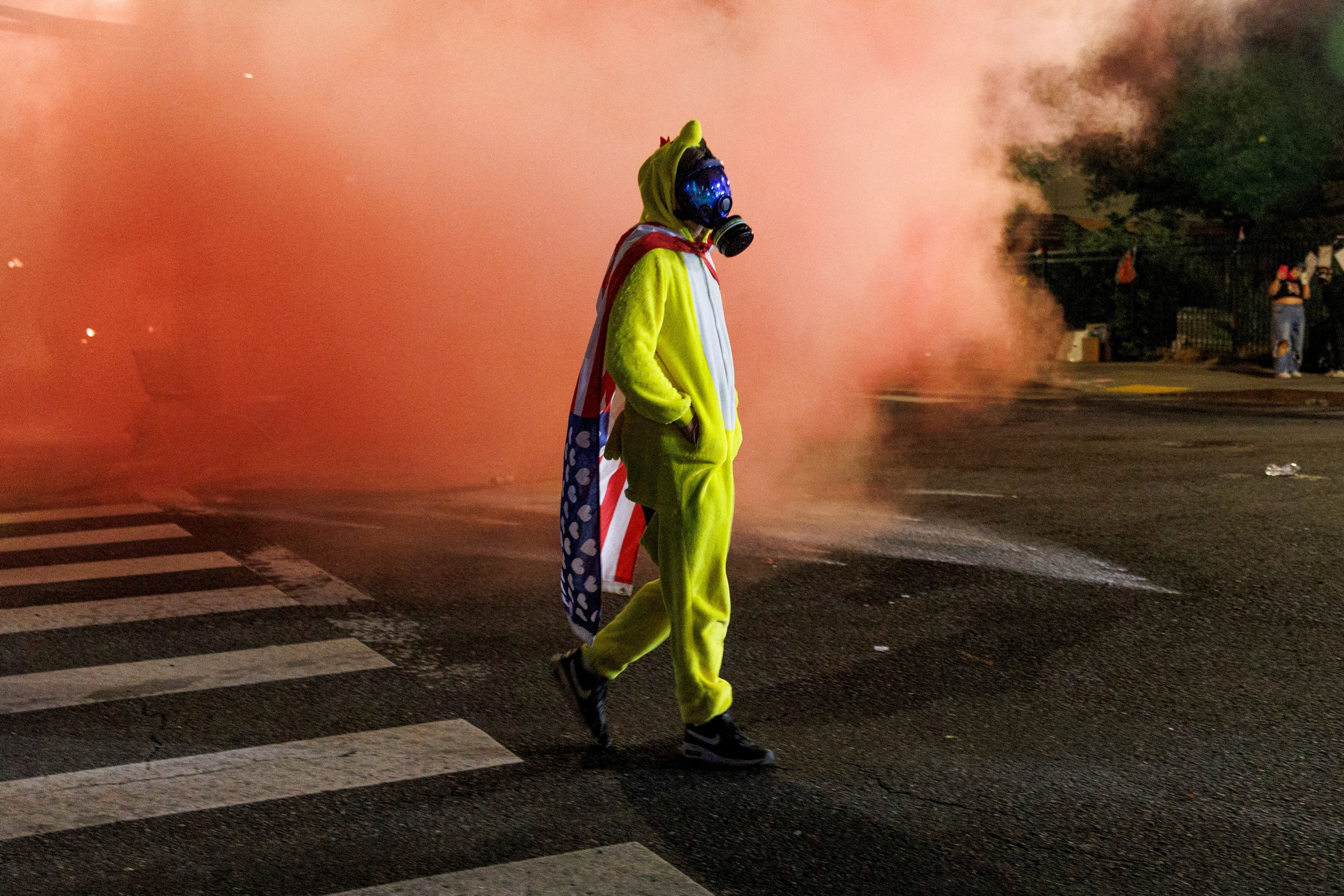 A protester walks amid tear gas and red smoke during a protest against the U.S. President Donald Trump administration's immigration policies, outside an ICE detention facility in Portland, Oregon, U.S., on September 1, 2025. (Photo by John Rudoff/Reuters)