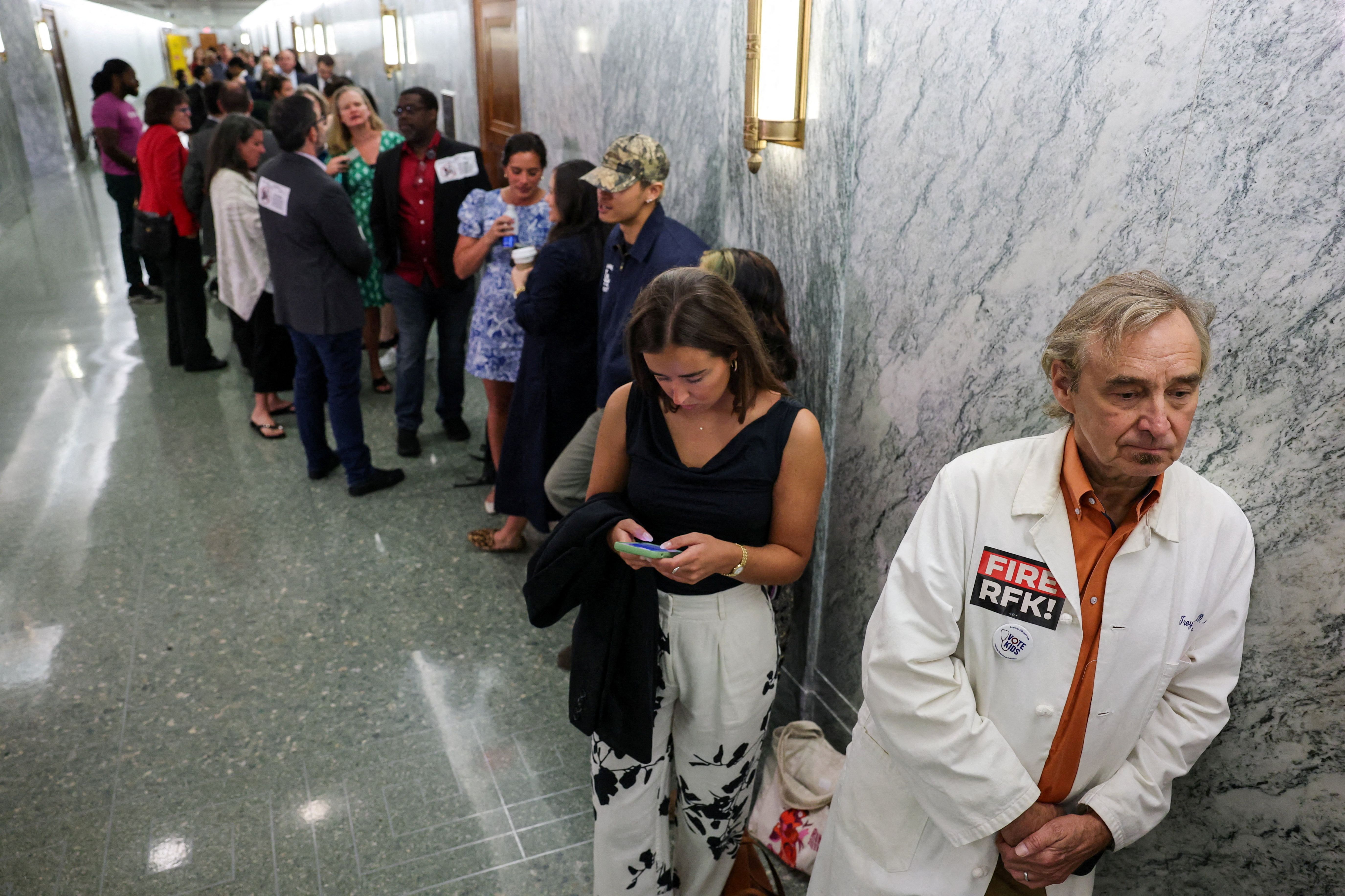 Dr. Troy Jacobs, a Washington-area pediatrician, wears a lab coat with a ''FIRE RFK'' sticker as he is among the first in line to be in the public gallery to watch a Senate Finance Committee hearing on President Trump's 2026 health care agenda, on Capitol Hill in Washington on September 4, 2025. (Photo by Jonathan Ernst/Reuters)