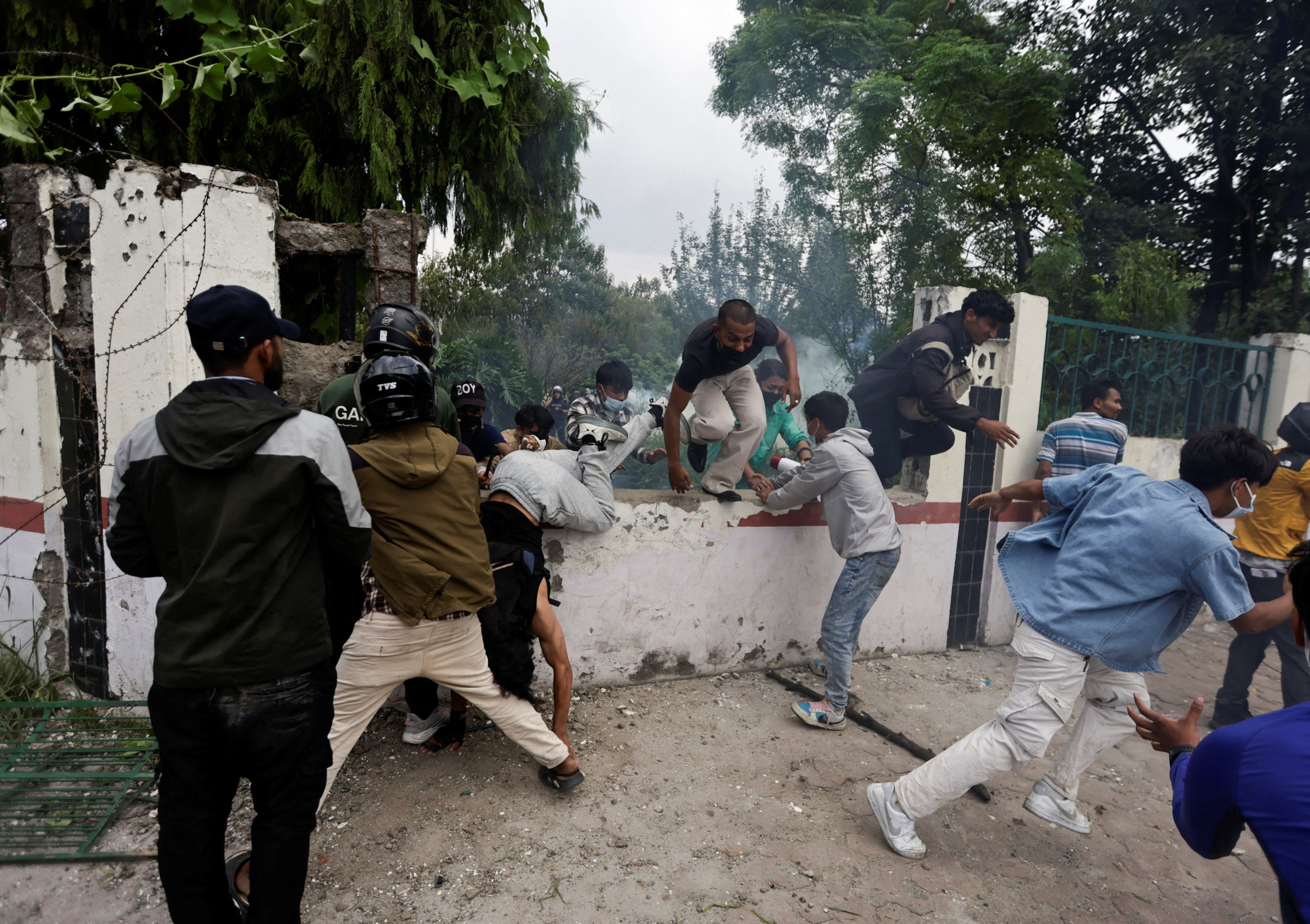 Demonstrators jump out from the boundary wall of the parliament after being chased away by the riot police during a protest against corruption and the government's decision to block several social media platforms, in Kathmandu, Nepal on September 8, 2025. (Photo by Navesh Chitrakar/Reuters)