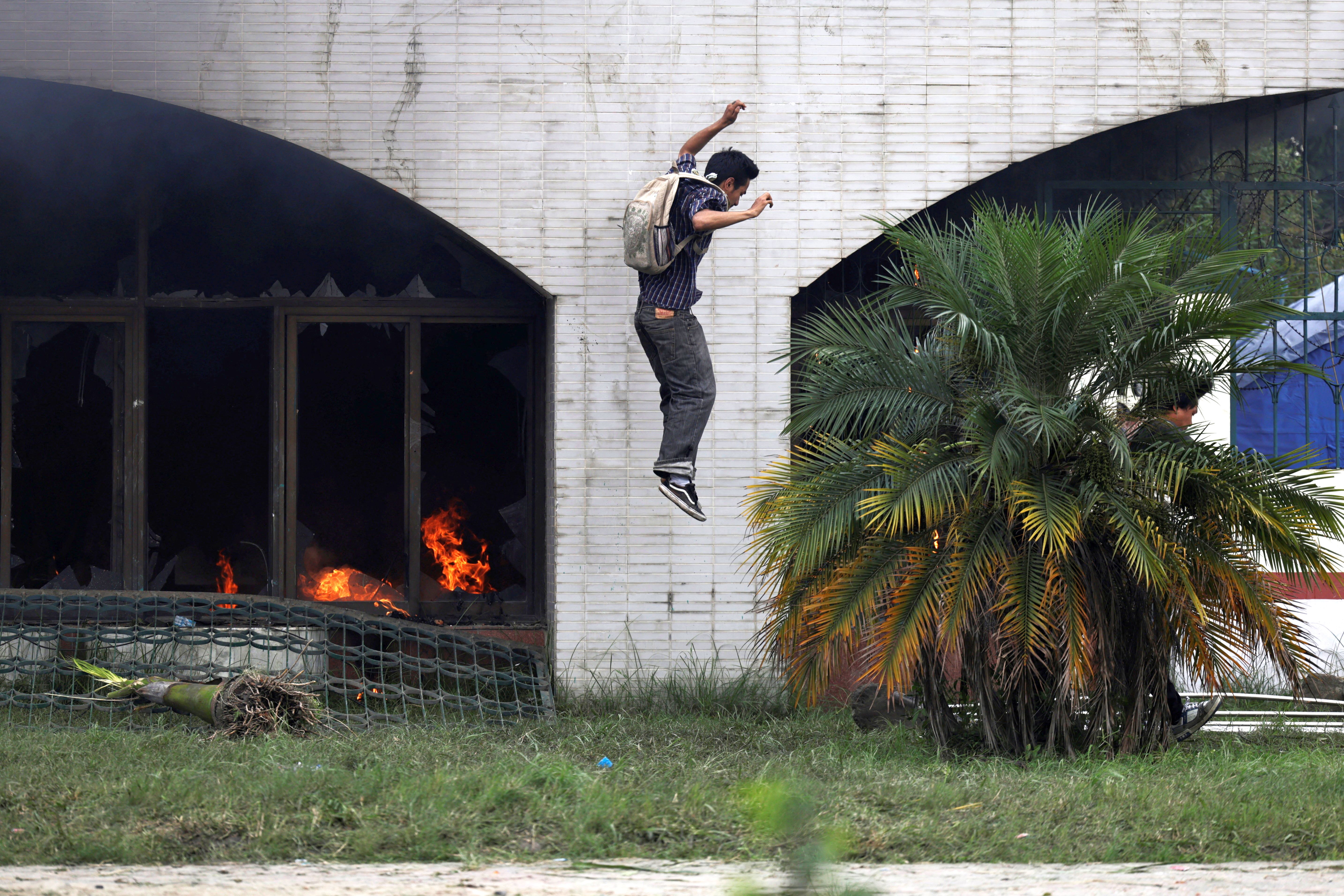 A demonstrator jumps from the gate of the Parliament during a protest against corruption and the government’s decision to block several social media platforms, in Kathmandu, Nepal on September 8, 2025. (Photo by Navesh Chitrakar/Reuters)