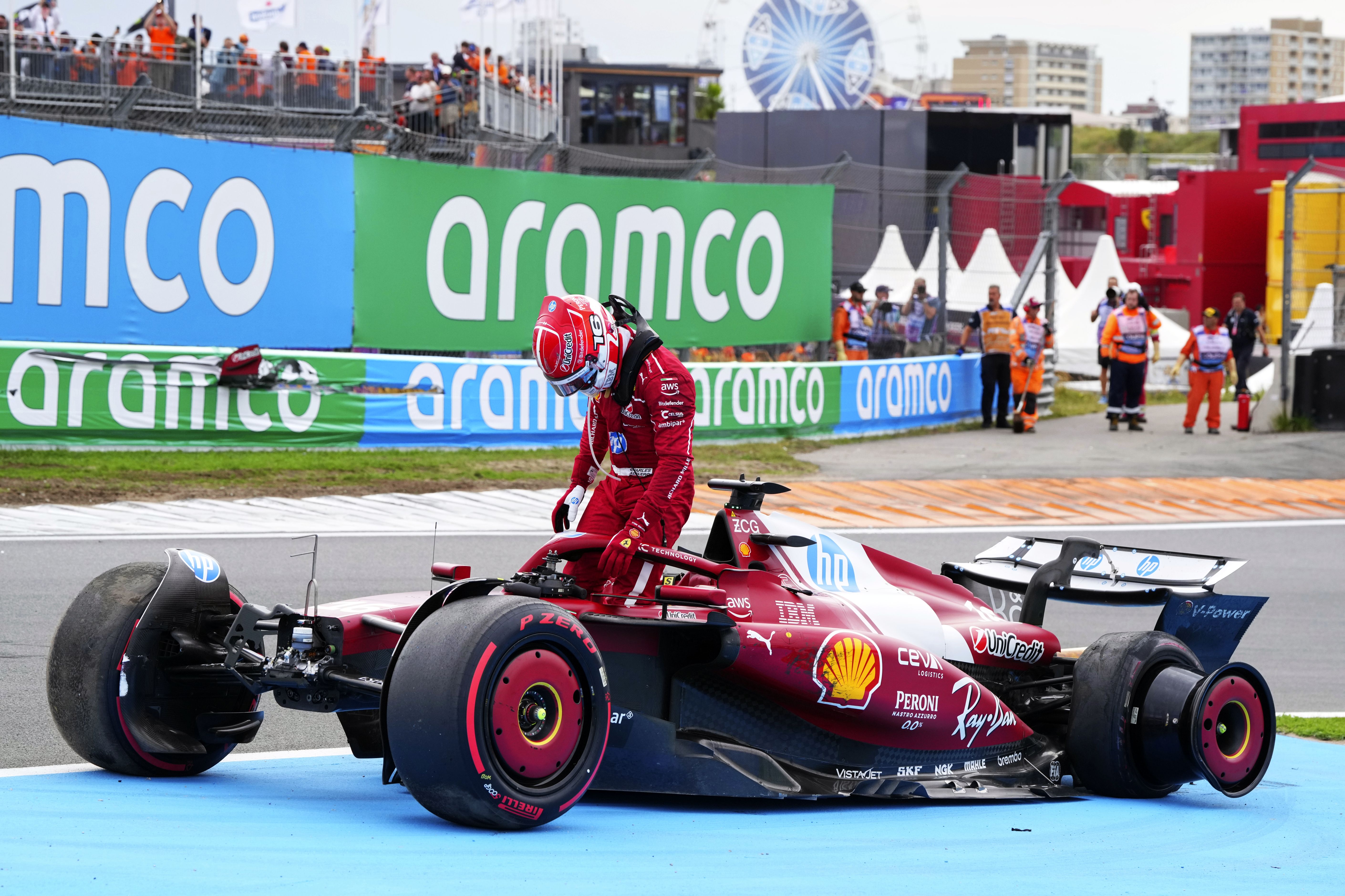 Ferrari driver Charles Leclerc of Monaco gets put of the car after a crash during the Formula One Dutch Grand Prix in Zandvoort, Netherlands, Sunday, August 31, 2025. (Photo by Peter Dejong/AP Photo)