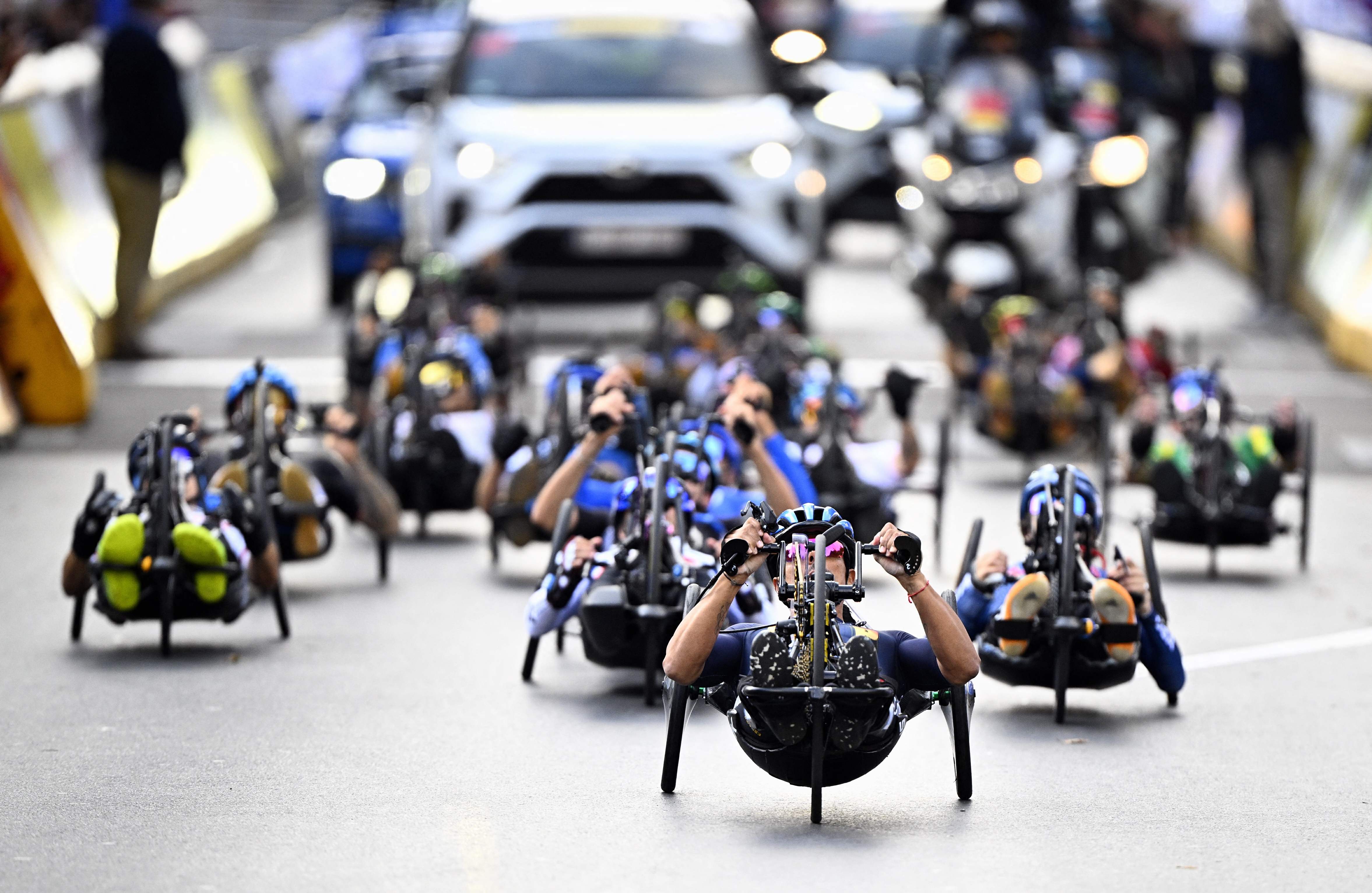 Competitors take part in the UCI Para-cycling Road World Championships, in Ronse, on August 30, 2025, in Ronse. The UCI Para-Cycling Road World Championships take place from August 28 to 31. (Photo by Jasper Jacobs/Belga via AFP Photo)