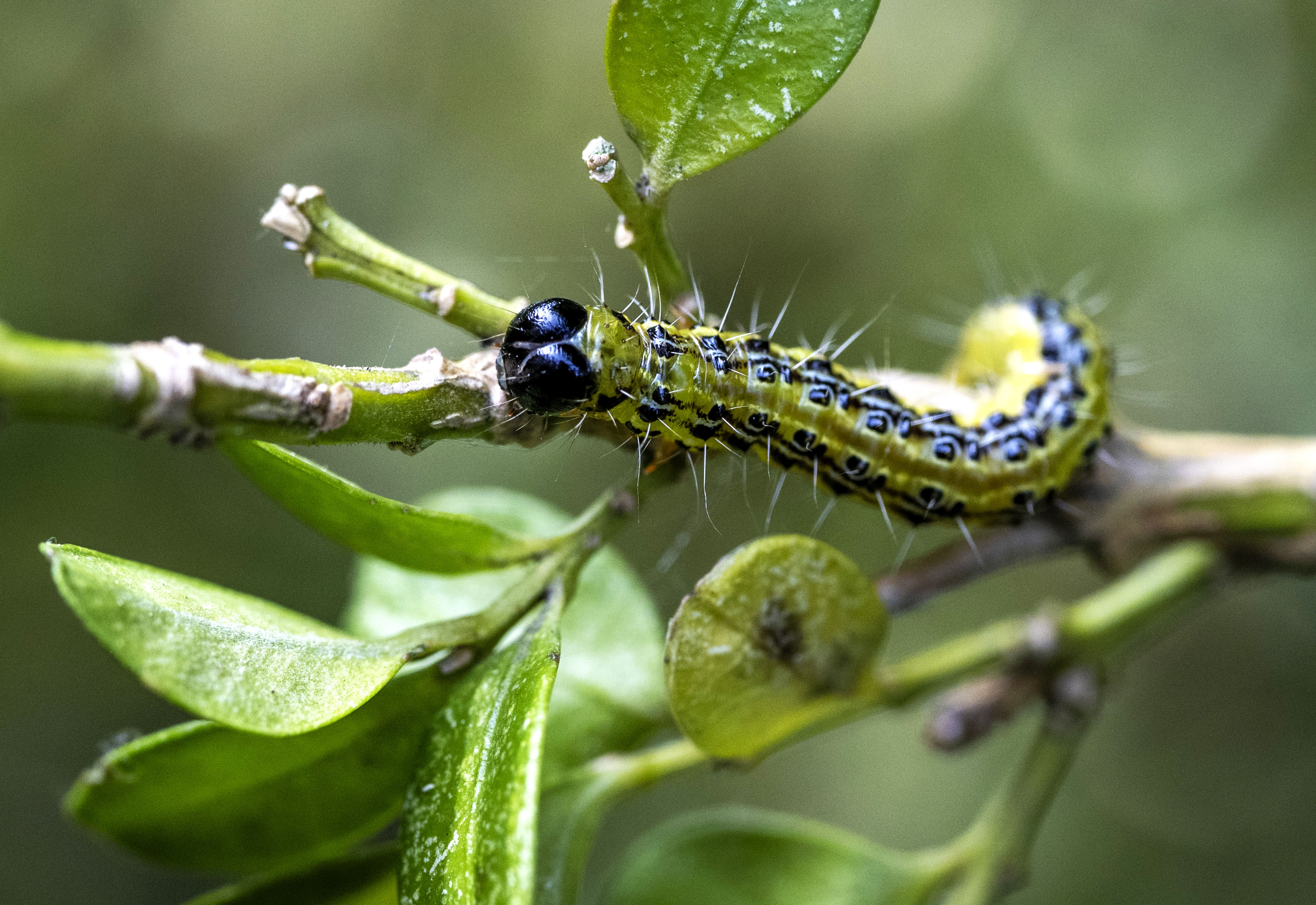 A boxwood moth, box tree moth, on a boxwood twig in a garden in Malmö, Sweden on August 28, 2025. (Photo by Johan Nilsson/TT via Rex Features/Shutterstock)