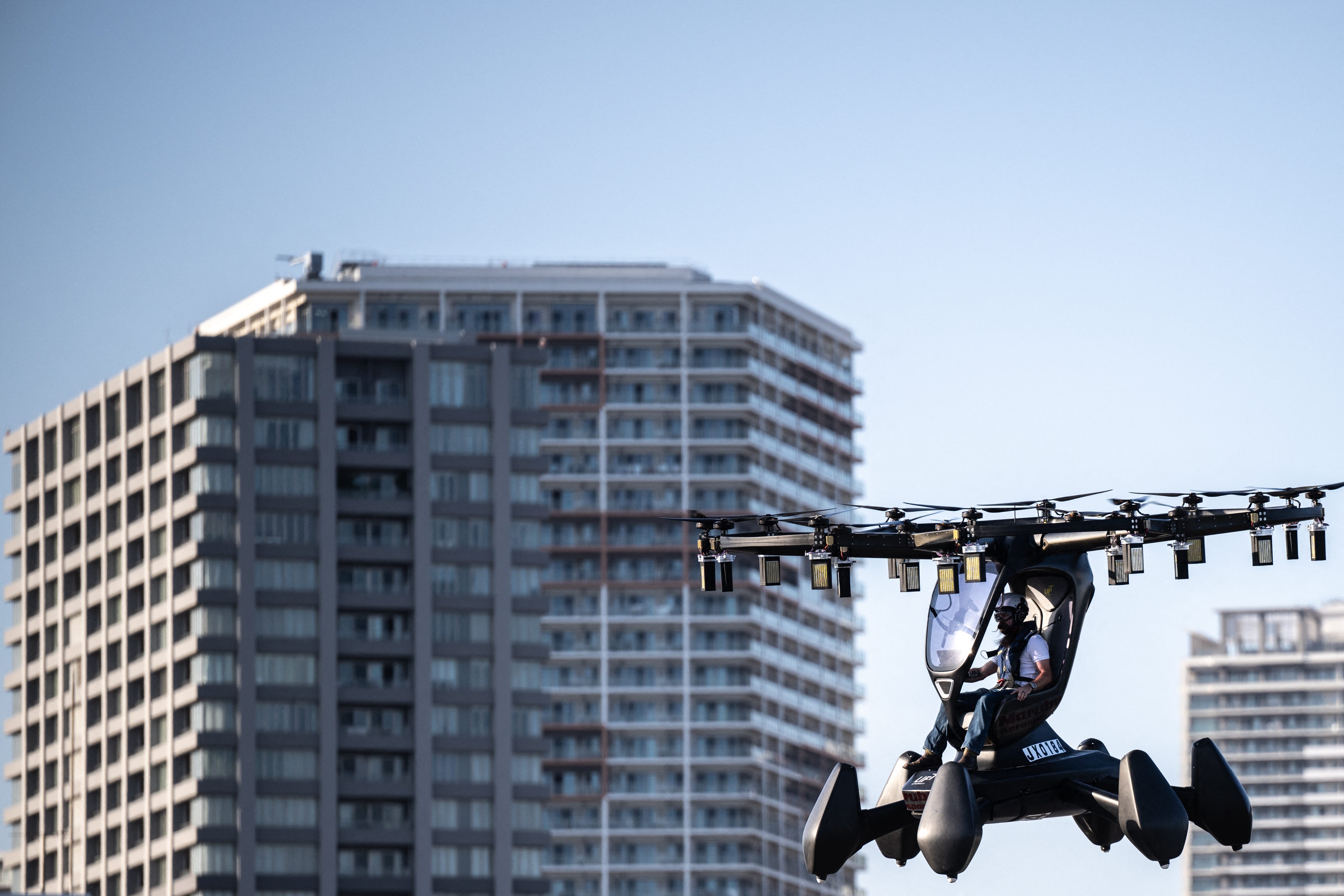 A flight operator controls the flying car “HEXA” developed by LIFT Aircraft Inc at the Tokyo Big Sight in Tokyo on May 17, 2024. (Photo by Philip Fong/AFP Photo)