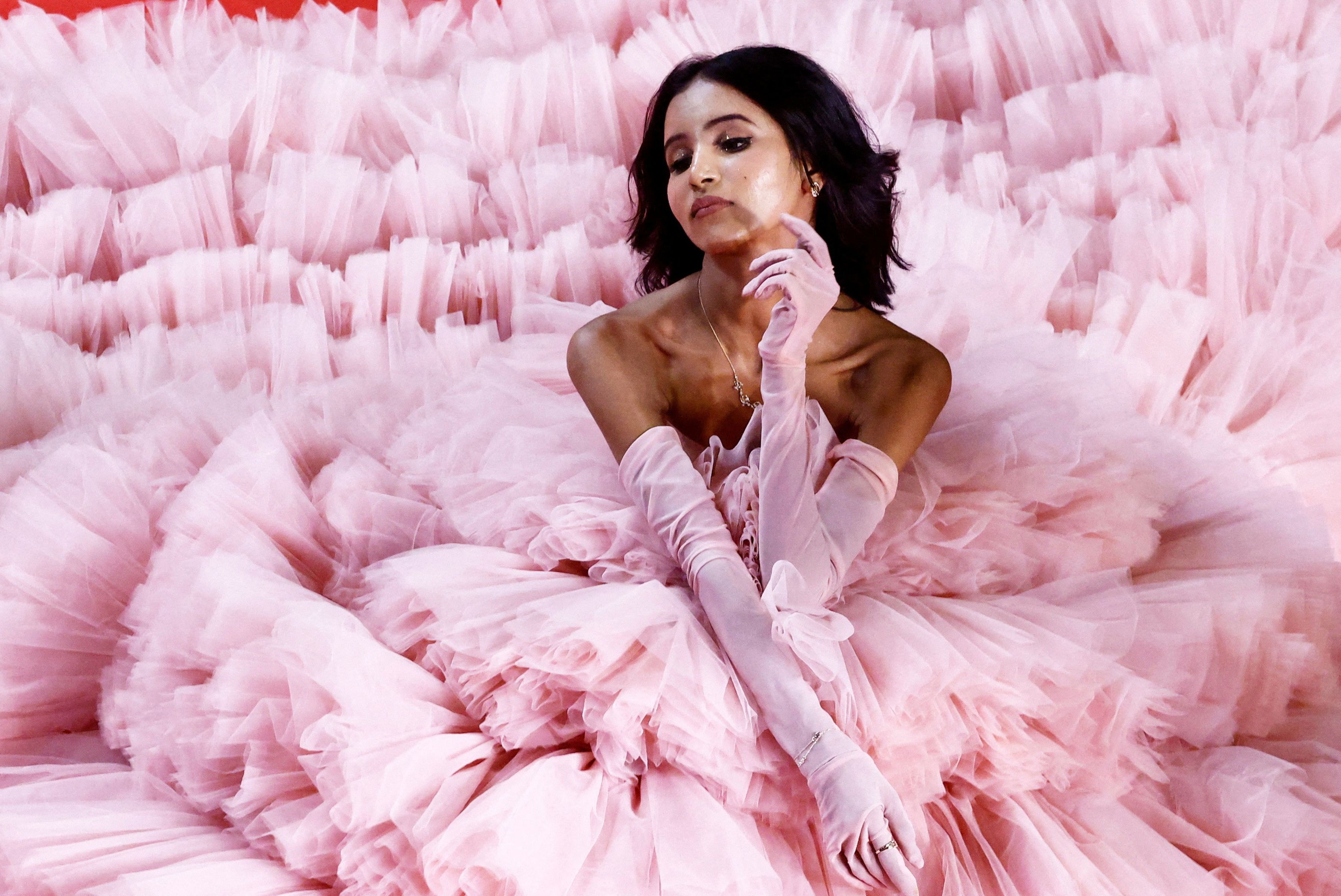 A guest poses on the red carpet during arrivals for the screening of the film “Oh Canada” in competition at the 77th Cannes Film Festival in Cannes, France, on May 17, 2024. (Photo by Yara Nardi/Reuters)