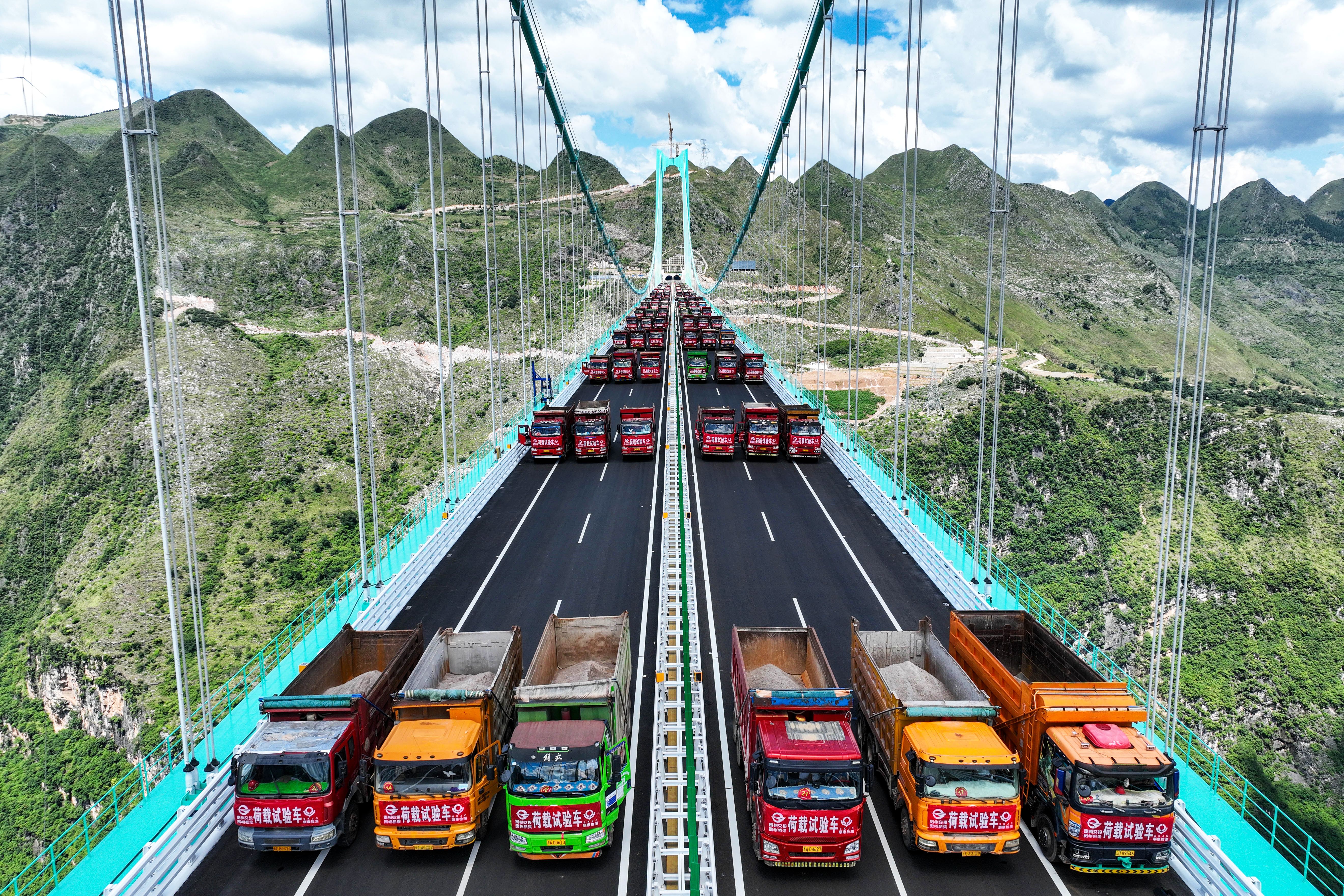 This aerial drone photo taken on Aug. 25, 2025 shows a load test on the Huajiang Grand Canyon Bridge in southwest China's Guizhou Province The Huajiang Grand Canyon Bridge, set to become the world's tallest bridge, had completed a key load test as of Monday, ahead of its scheduled opening in late September The bridge is 2,890 meters long with a main span of 1,420 meters. Rising 625 meters above the river, it will set the record for both the tallest bridge in the world and the world's largest span bridge built in a mountainous area, upon completion. (Photo by AFP Photo/China Stringer Network)
