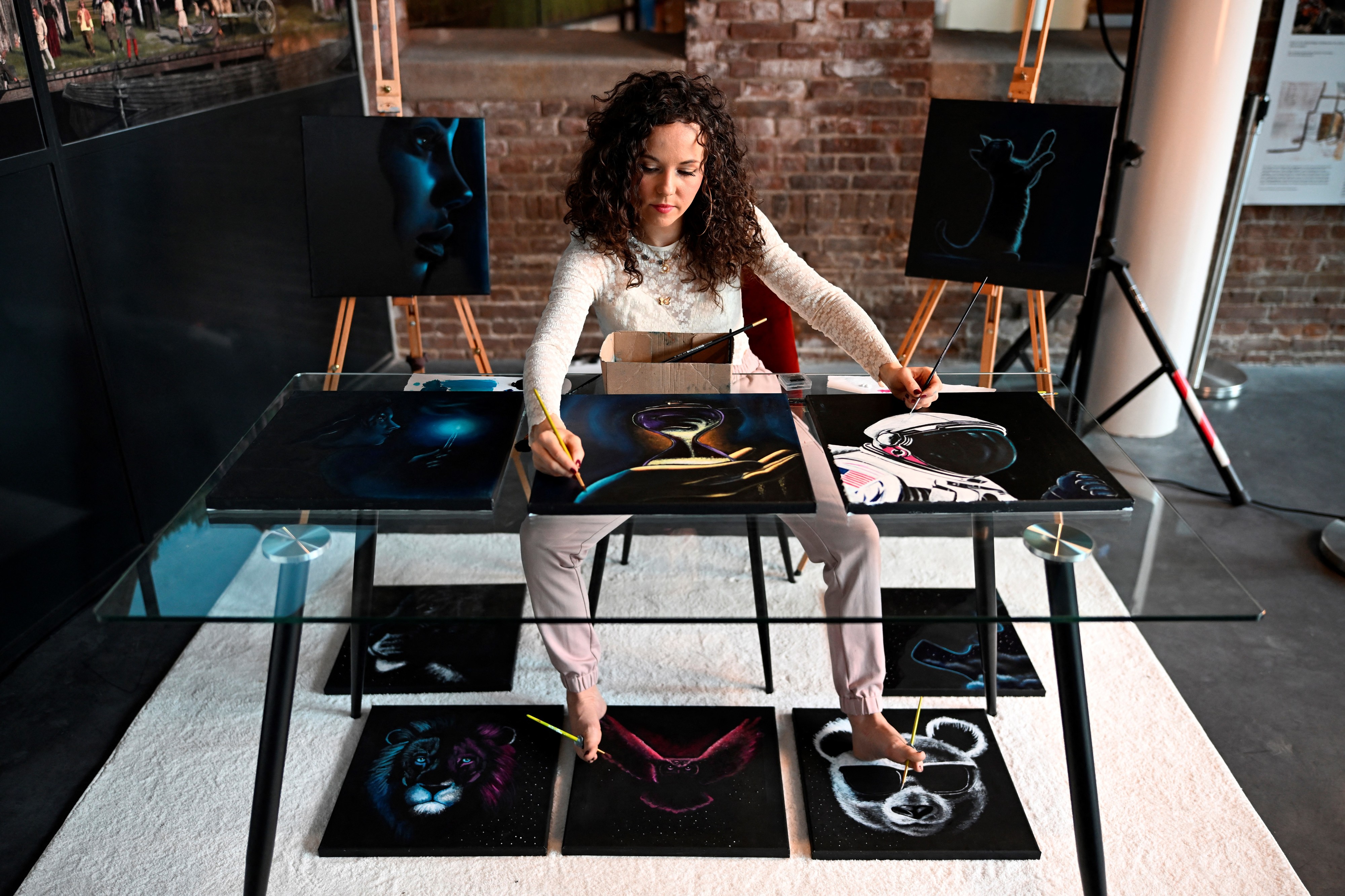 Dutch artist Rajacenna van Dam, paints ten paintings at once with both hands and feet, live in a museum in Vlaardingen, Netherlands on May 3, 2024. (Photo by John Thys/AFP Photo)