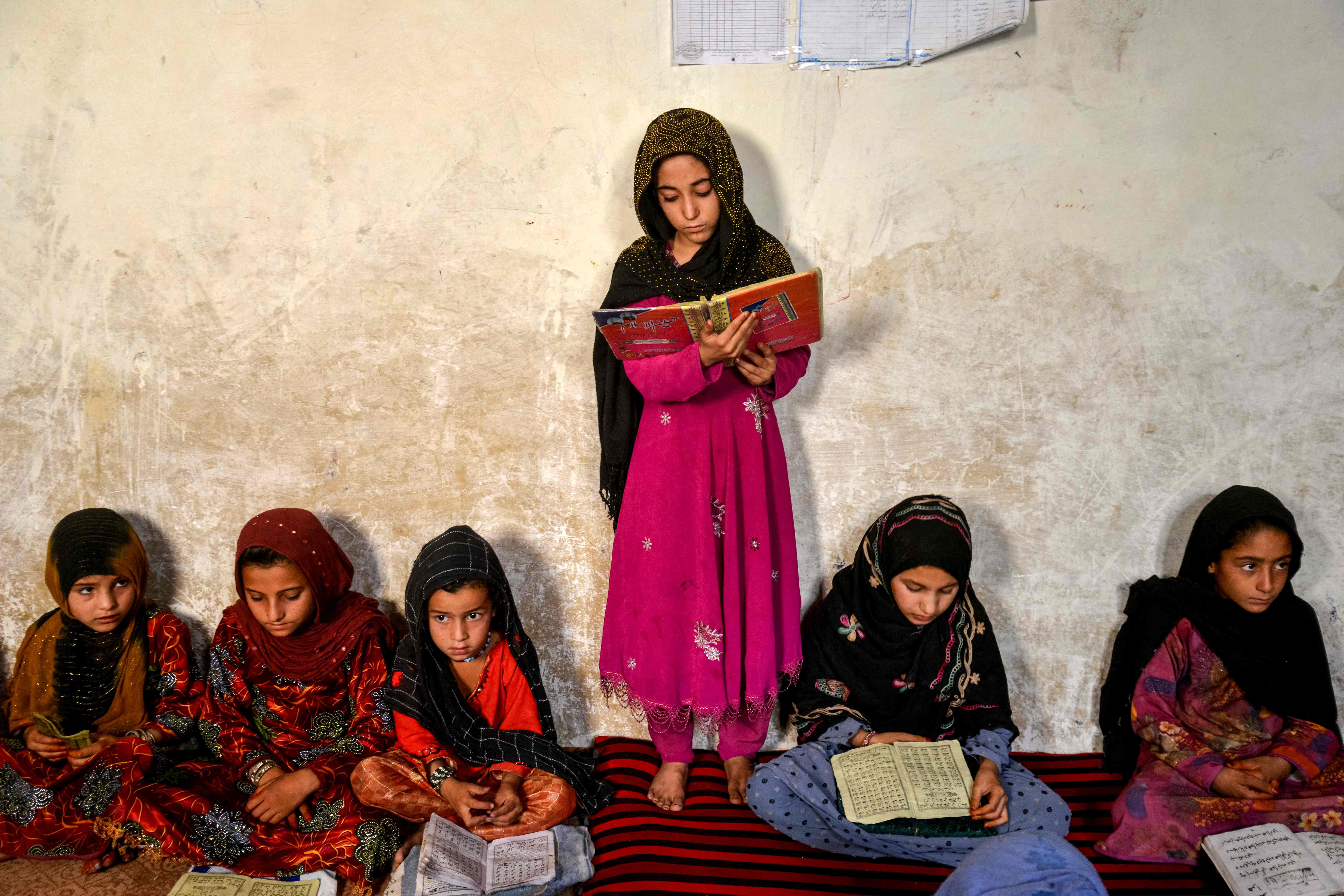 An Afghan girl reads a religious book at a madrassa, or an Islamic school, at Navai village in the Spin Boldak district of Kandahar on August 23, 2025. (Photo by Sanaullah Seiam/AFP Photo)