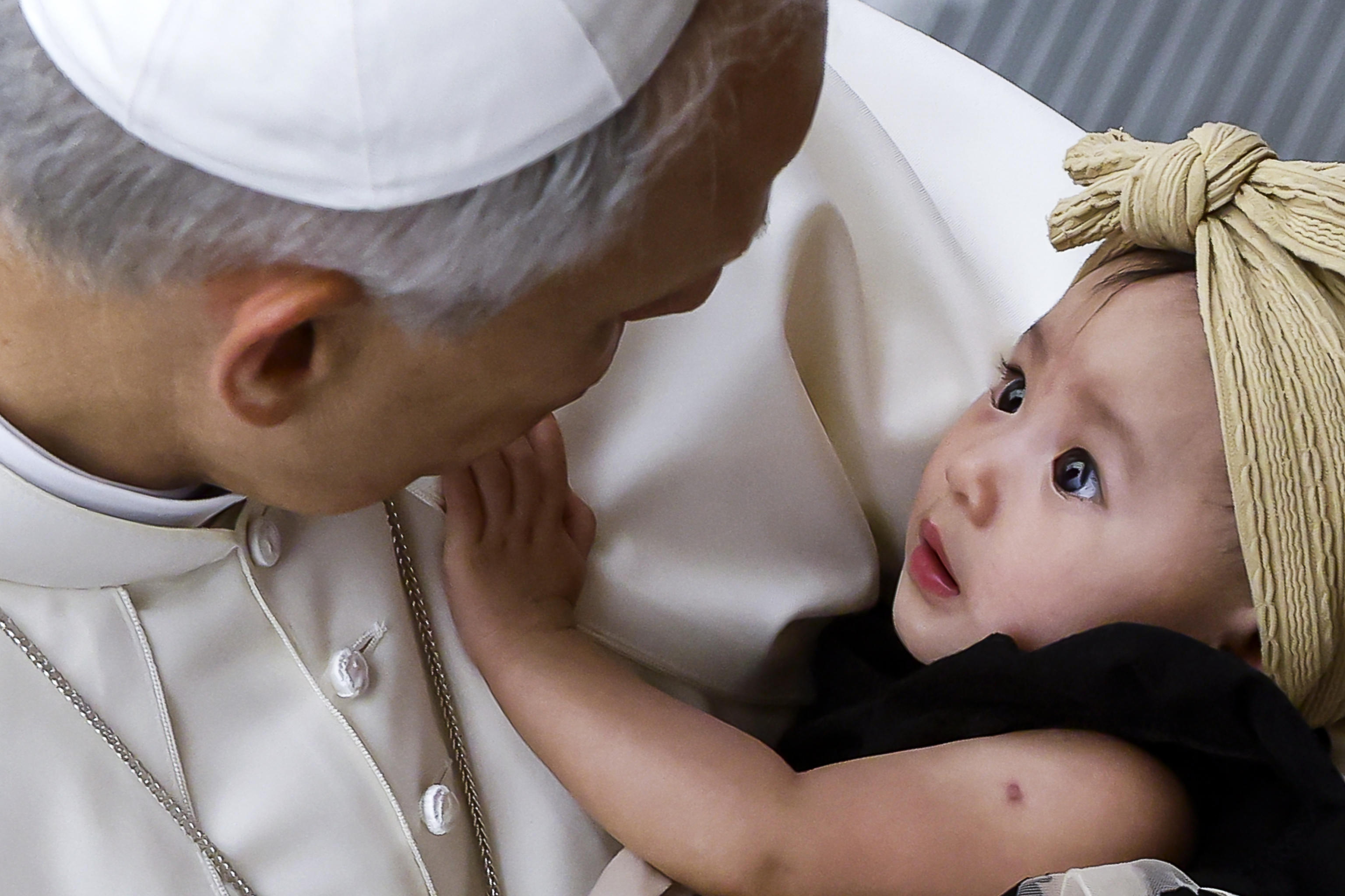 Pope Leo XIV holds a baby during the weekly general audience in the Paul VI Hall, Vatican City, 20 August 2025. (Photo by Angelo Carconi/EPA)