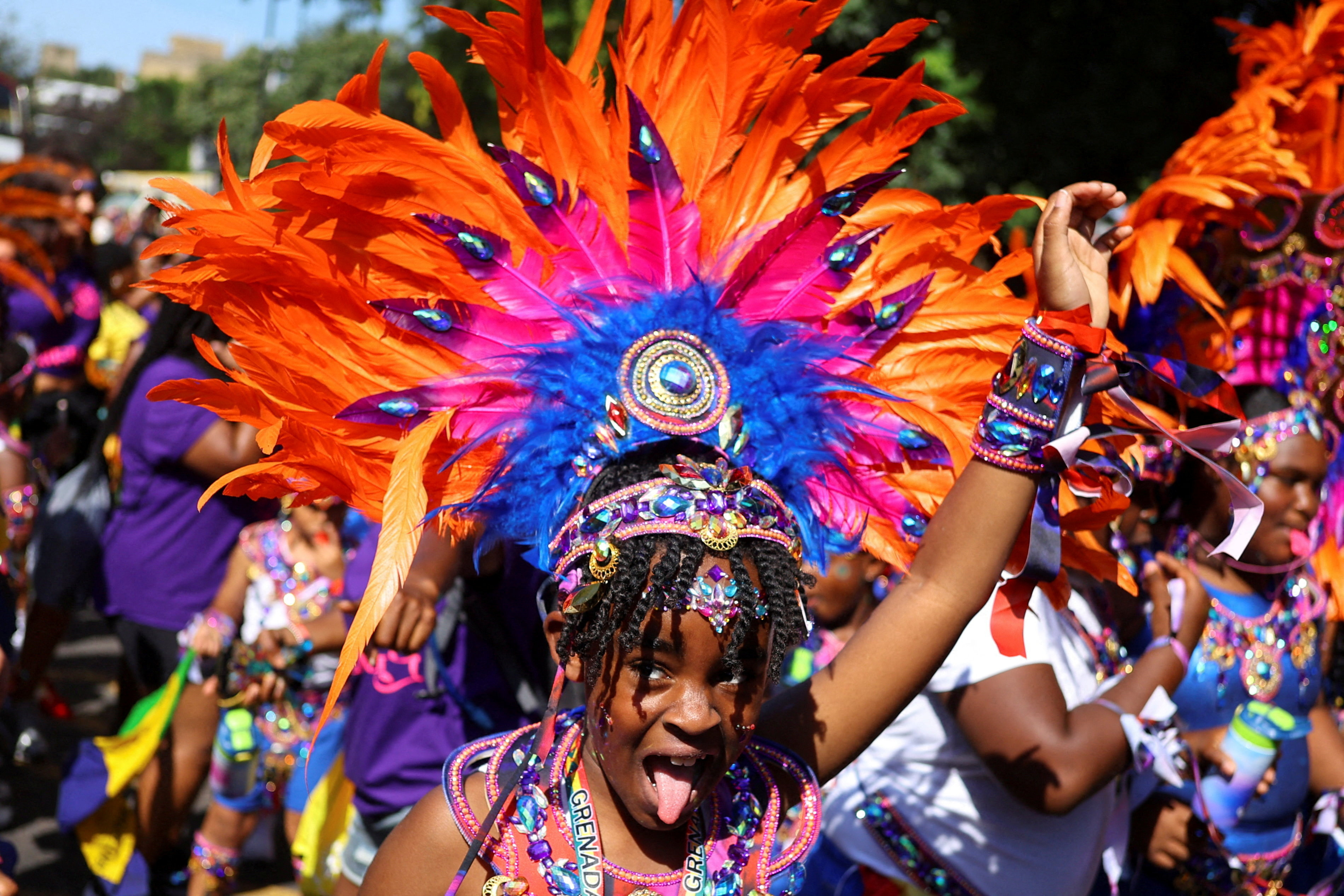 A child, wearing a headdress, gestures at the Children's Day Parade, during Notting Hill Carnival, in London, Britain on August 24, 2025. (Photo by Toby Melville/Reuters)
