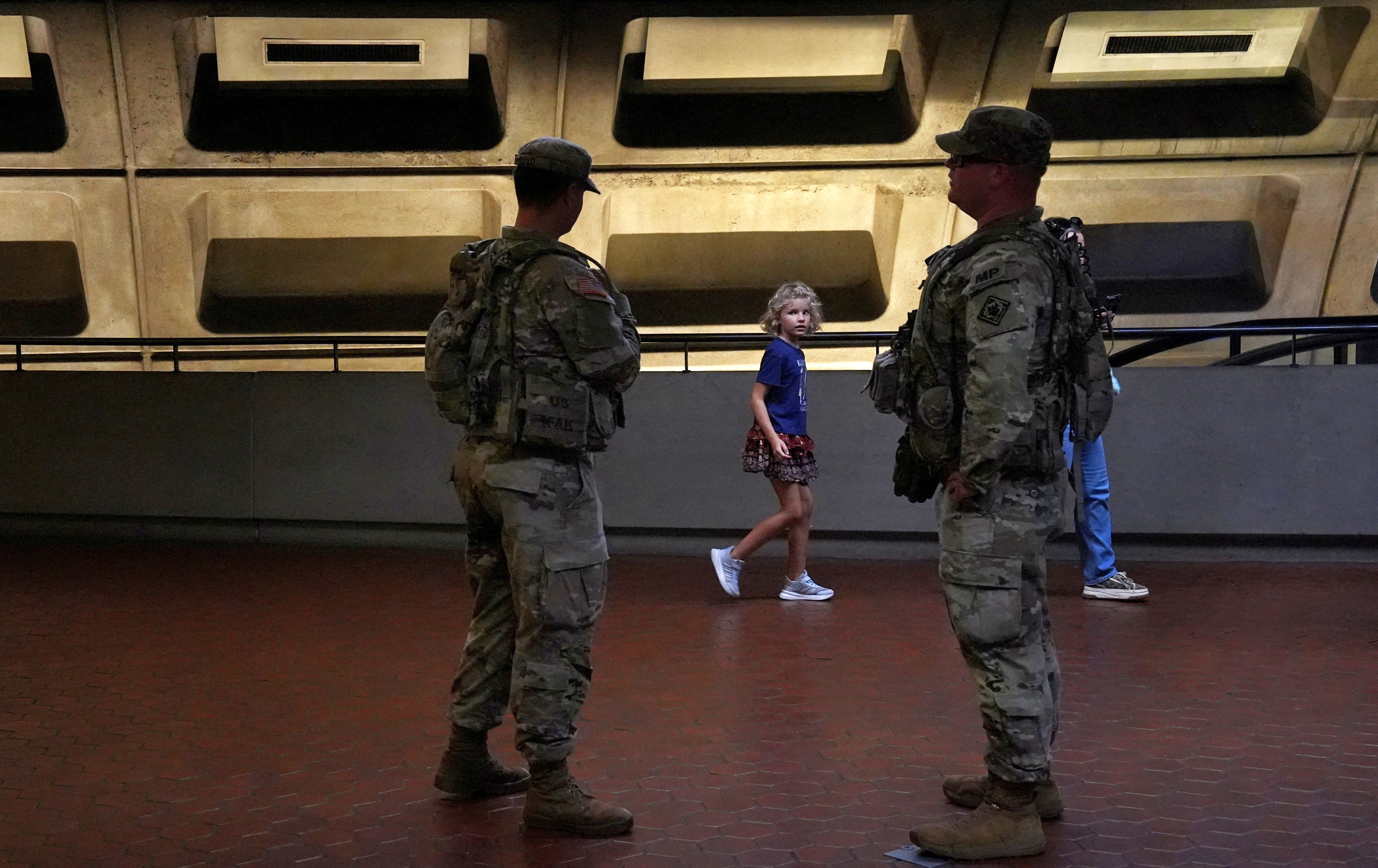 A child walks past two members of the National Guard from Mississippi posted in the Metro weeks after U.S. President Donald Trump deployed the National Guard and ordered an increased presence of federal law enforcement, in Washington, D.C., U.S., September 5, 2025. (Photo by Leah Millis/Reuters)