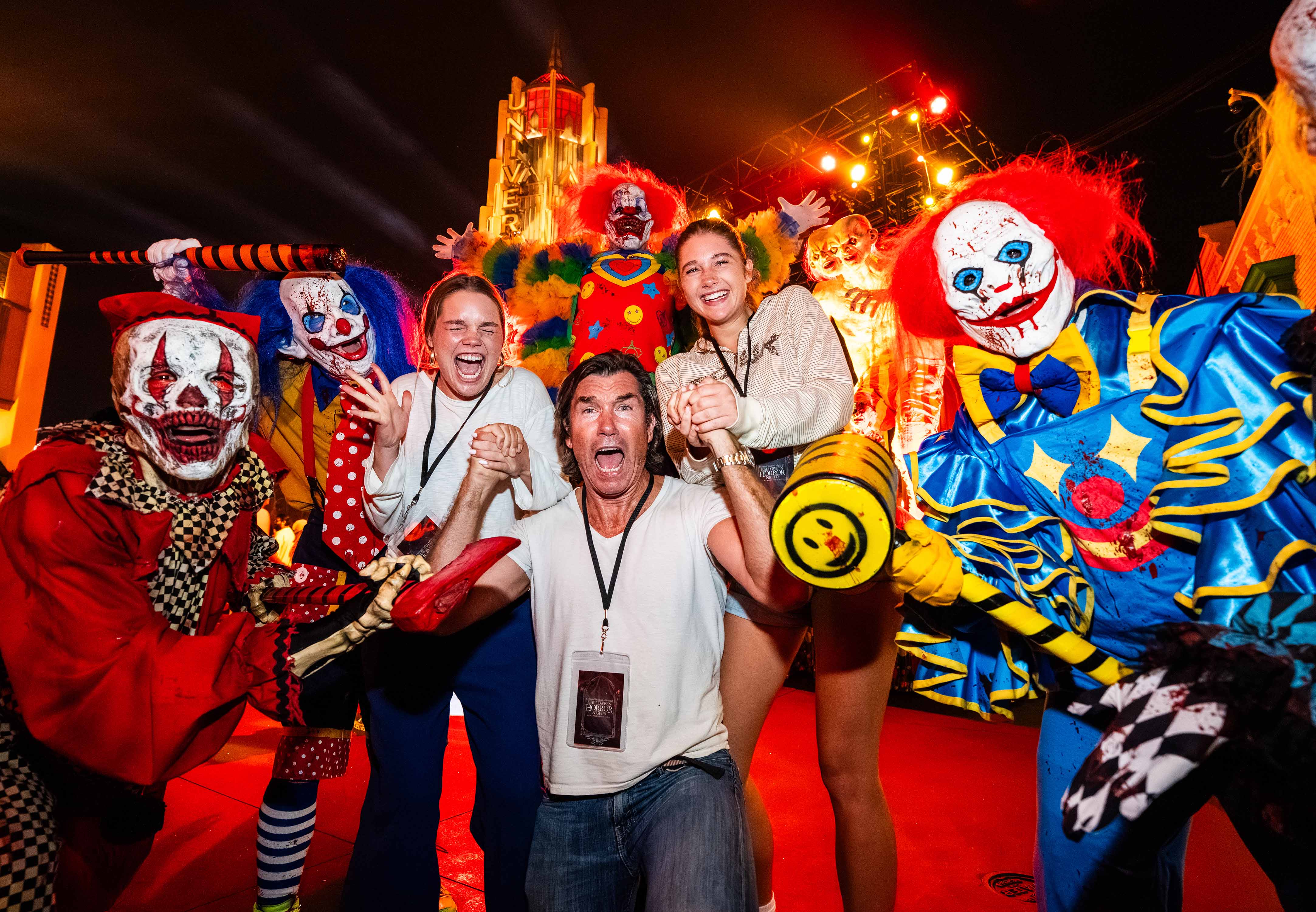Jerry O’Connell and his daughters, Dolly and Charlie, have a good scream with twisted jesters at Universal Studios Hollywood’s Halloween Horror Nights on September 5, 2025. (Photo by Hamilton Pytluk)