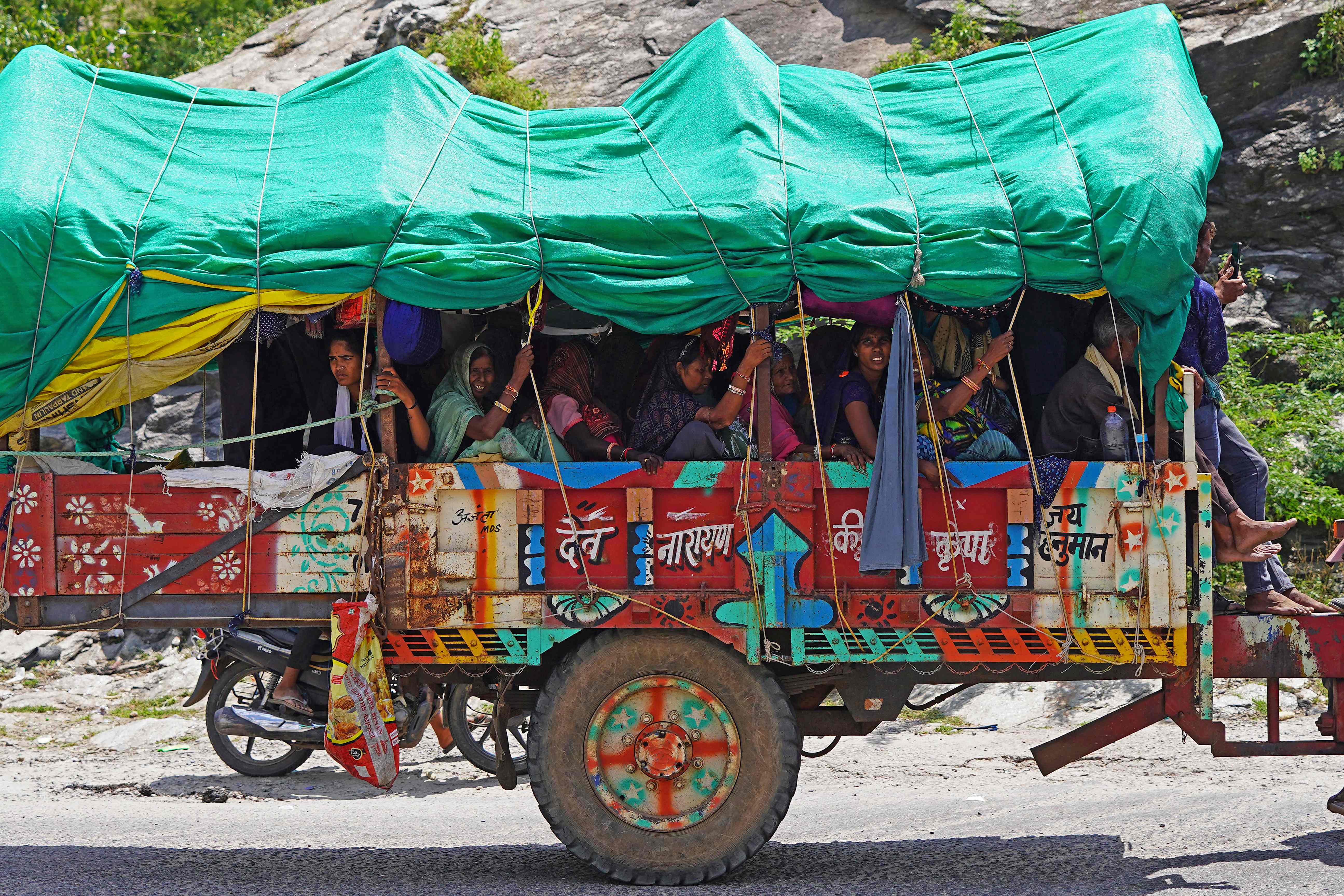 Villagers travel in a tractor trolley to attend an annual fair, in Ajmer on August 20, 2025. (Photo by Himanshu Sharma/AFP Photo)