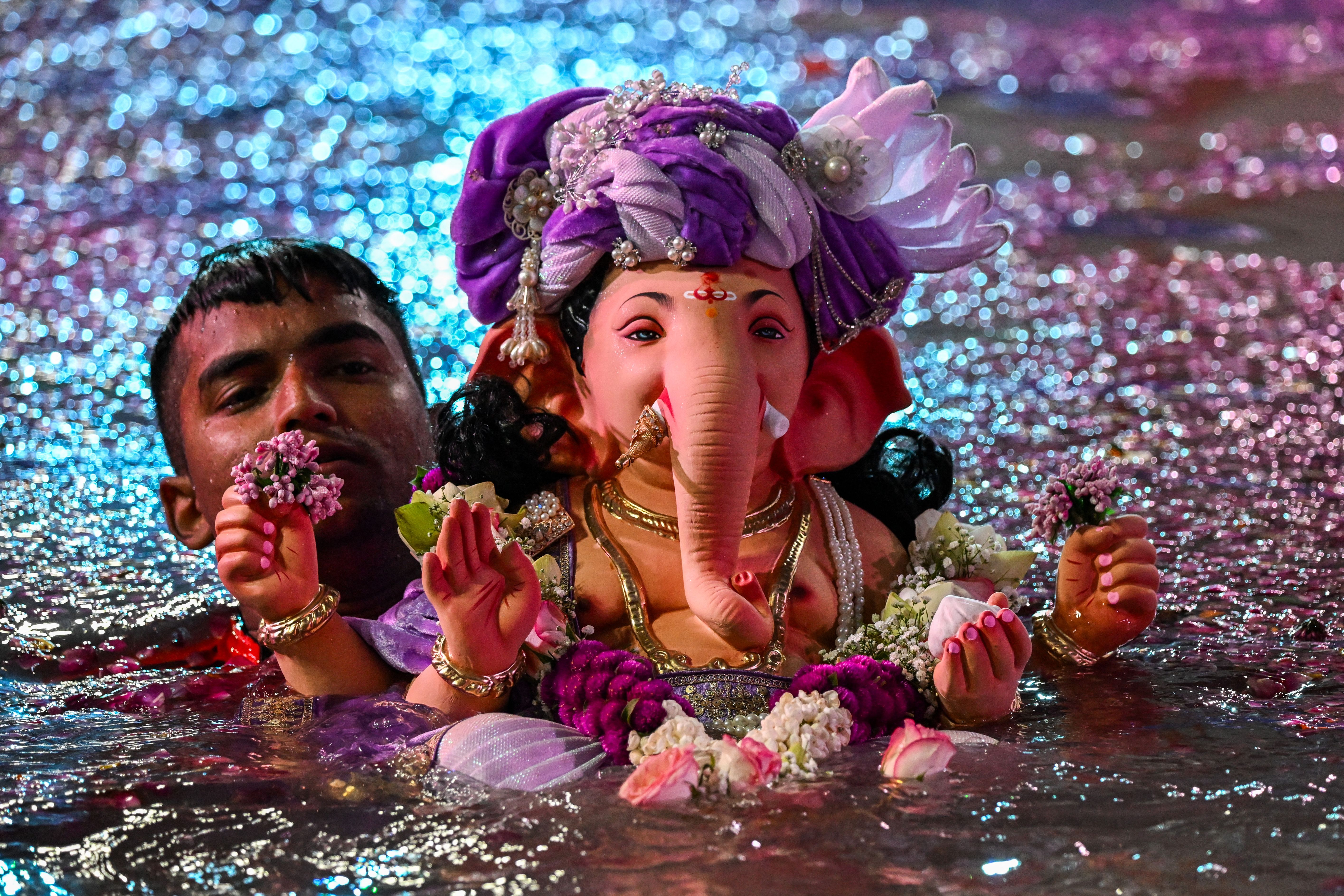 A Hindu devotee immerses an idol of the elephant-headed deity Lord Ganesha in an artificial pond on the occasion of Ganesh Chaturthi festival in Mumbai on August 31, 2025. (Photo by Punit Paranjpe/AFP Photo)