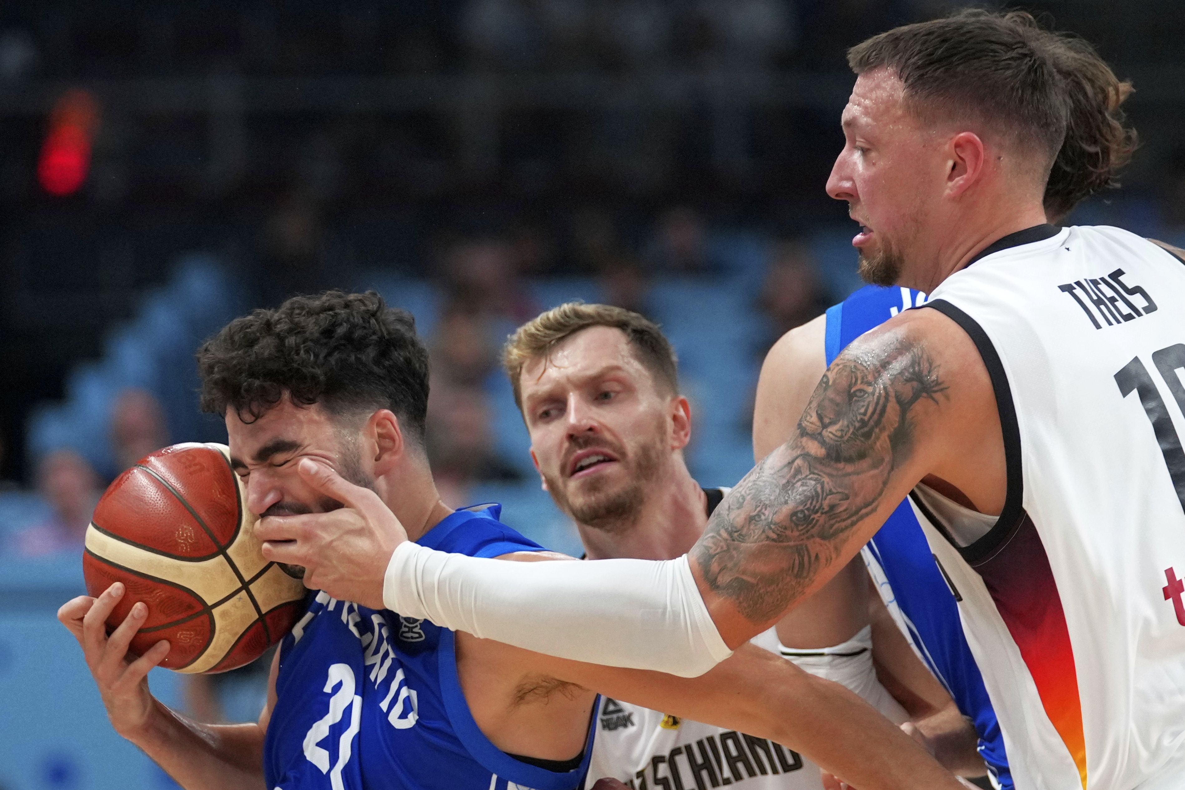 Germany's Daniel Theis, right, in action against Finland's Edon Maxhuni during the Eurobasket, European Basketball Championship semi-final match between Germany and Finland at the Riga Arena in Riga, Latvia, Friday, September 12, 2025. (Photo by Sergei Grits/AP Photo)