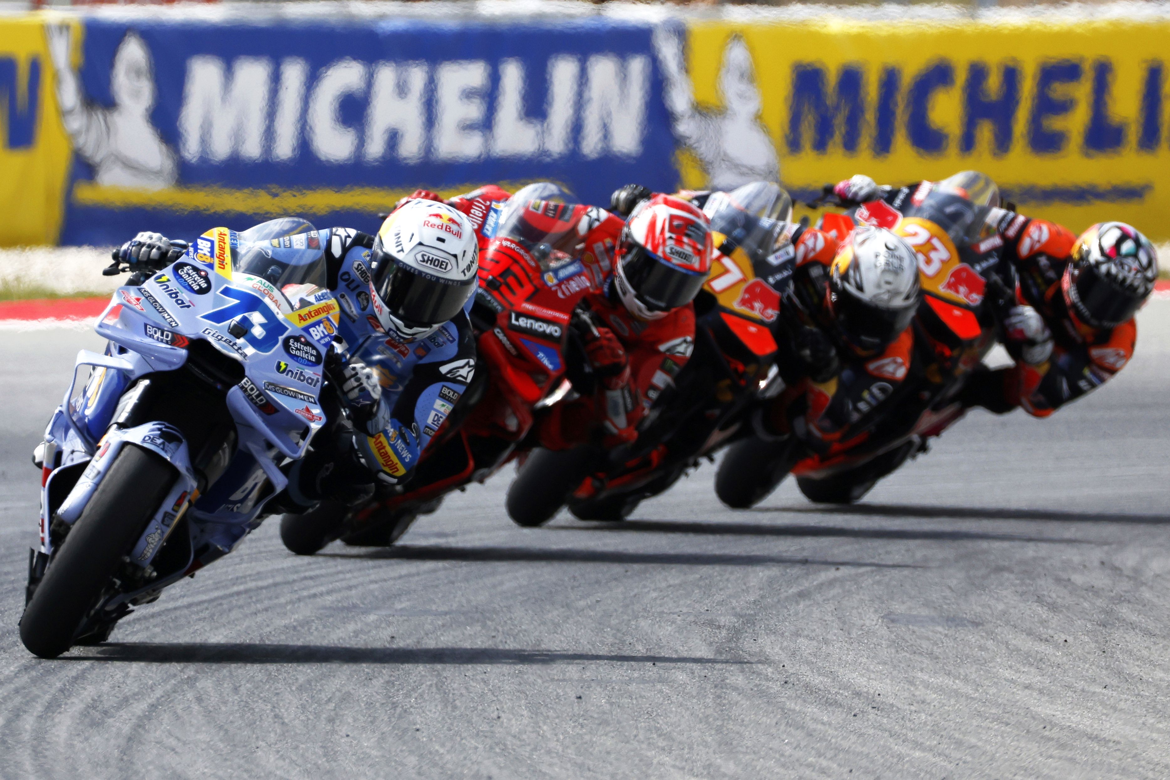 Spain's rider Alex Marquez of the BK8 Gresini Racing MotoGP leads the MotoGP race of the Grand Prix of Catalonia in Montmelo, just outside of Barcelona, Spain, Sunday, September 7, 2025. (Photo by Joan Monfort/AP Photo)