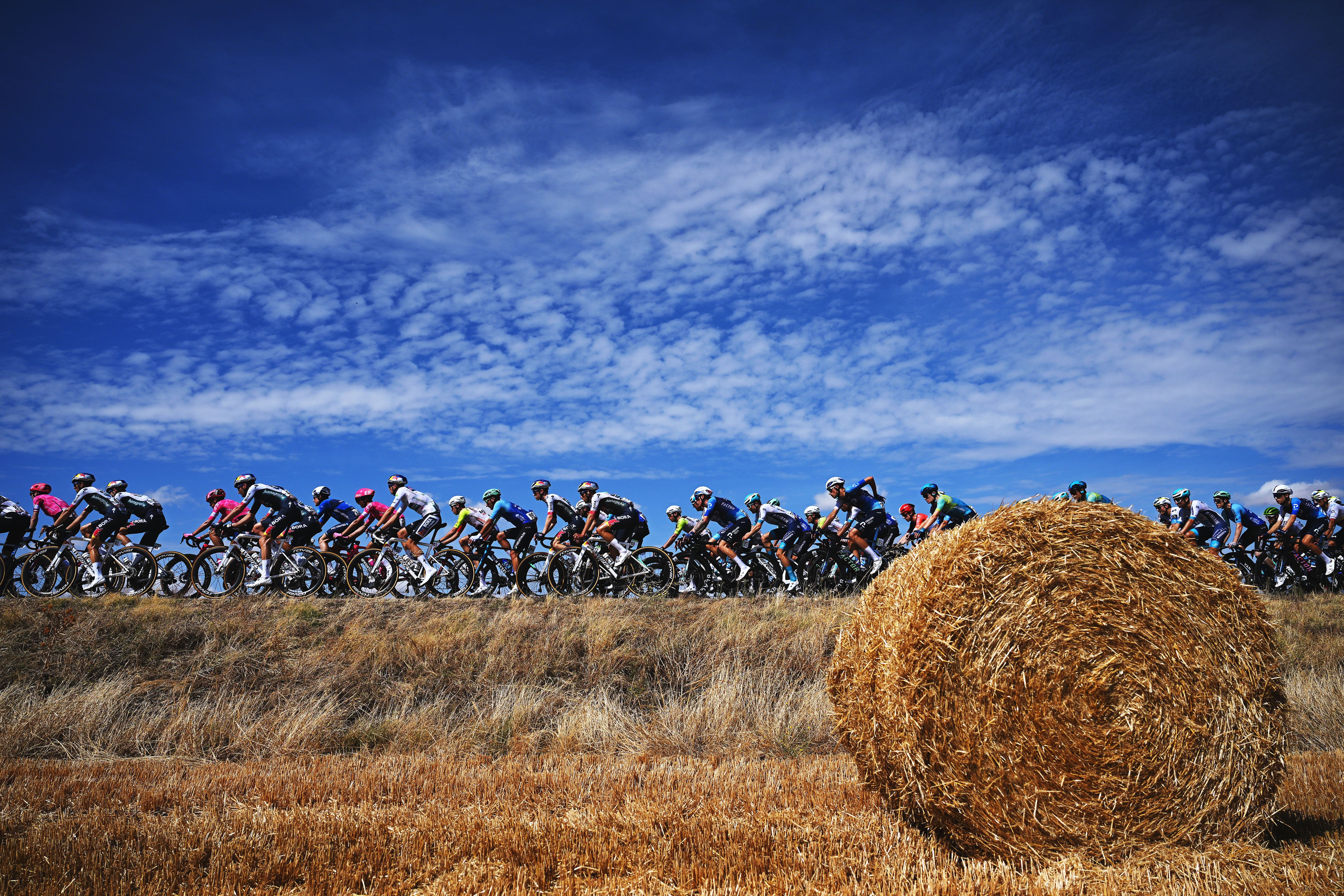 A general view of the peloton passing through a landscape during the La Vuelta – 80th Tour of Spain 2025, Stage 19 a 161.9km stage from Rueda to Guijuelo/ #UCIWT / on September 12, 2025 in Guijuelo, Spain. (Photo by Dario Belingheri/Getty Images)