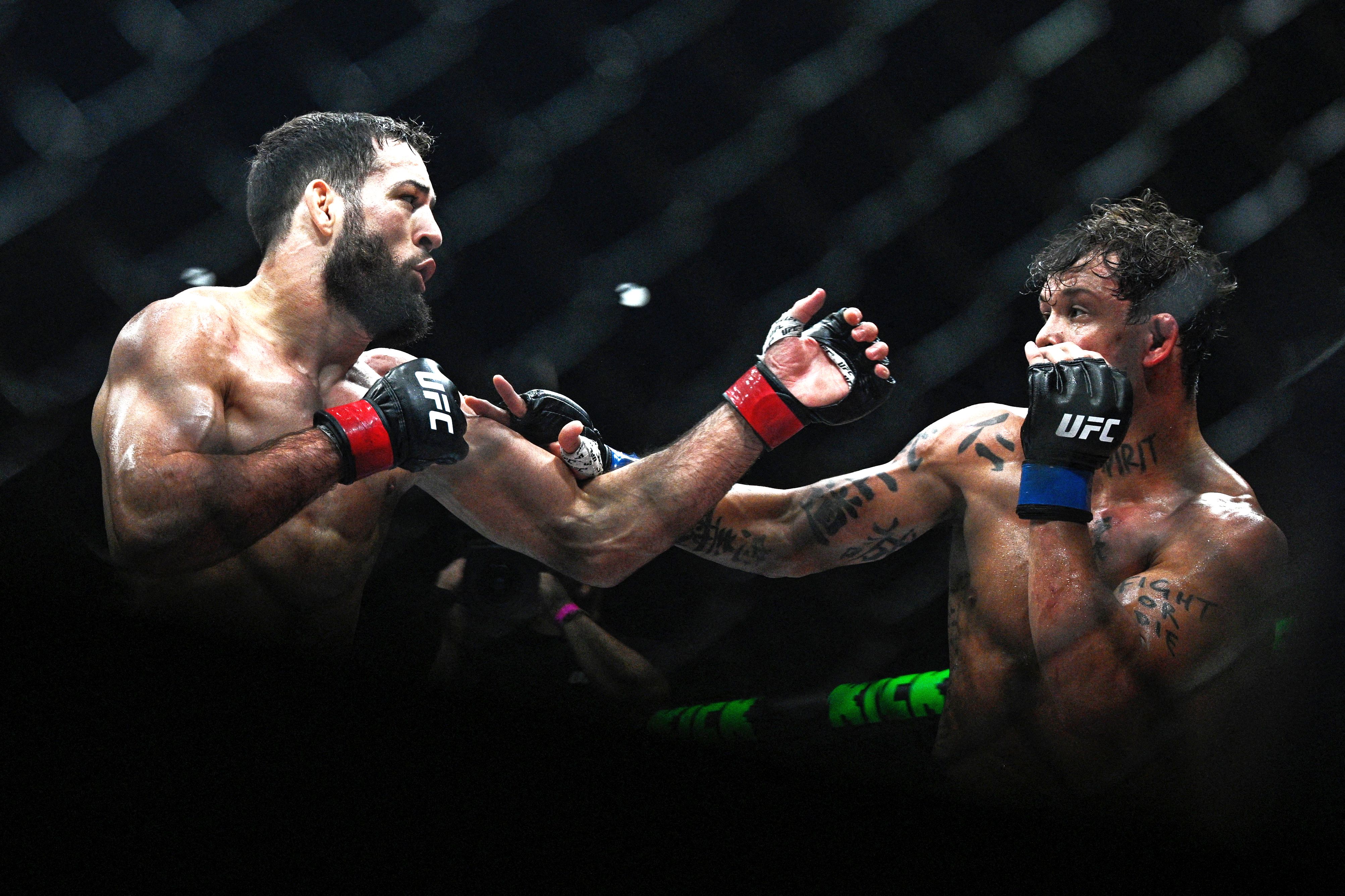 France's Nassourdine Imavov (L) fights against Brazil's Caio Borralho during their mixed martial arts at the 4th edition of the Ultimate Fighting Championship (UFC) average weights at the Bercy Accor Arena, in Paris, on September 6, 2025. (Photo by Julien de Rosa/AFP Photo)