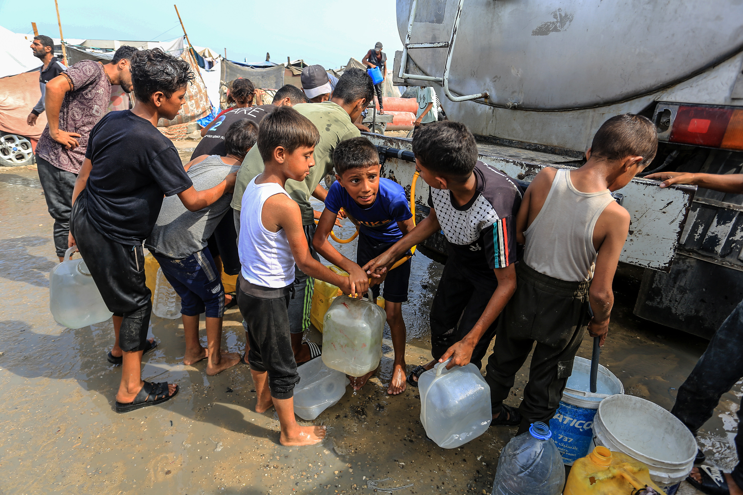An aid truck distributes water to Palestinians in Khan Yunis, Gaza, where residents carry the supplies in plastic jerrycans amid a worsening water crisis, on August 13, 2025. Israeli attacks have severely damaged the city's infrastructure, leaving much of the population without access to clean drinking water due to destroyed wells and storage facilities. (Photo by Abed Rahim Khatib/Anadolu via Getty Images)