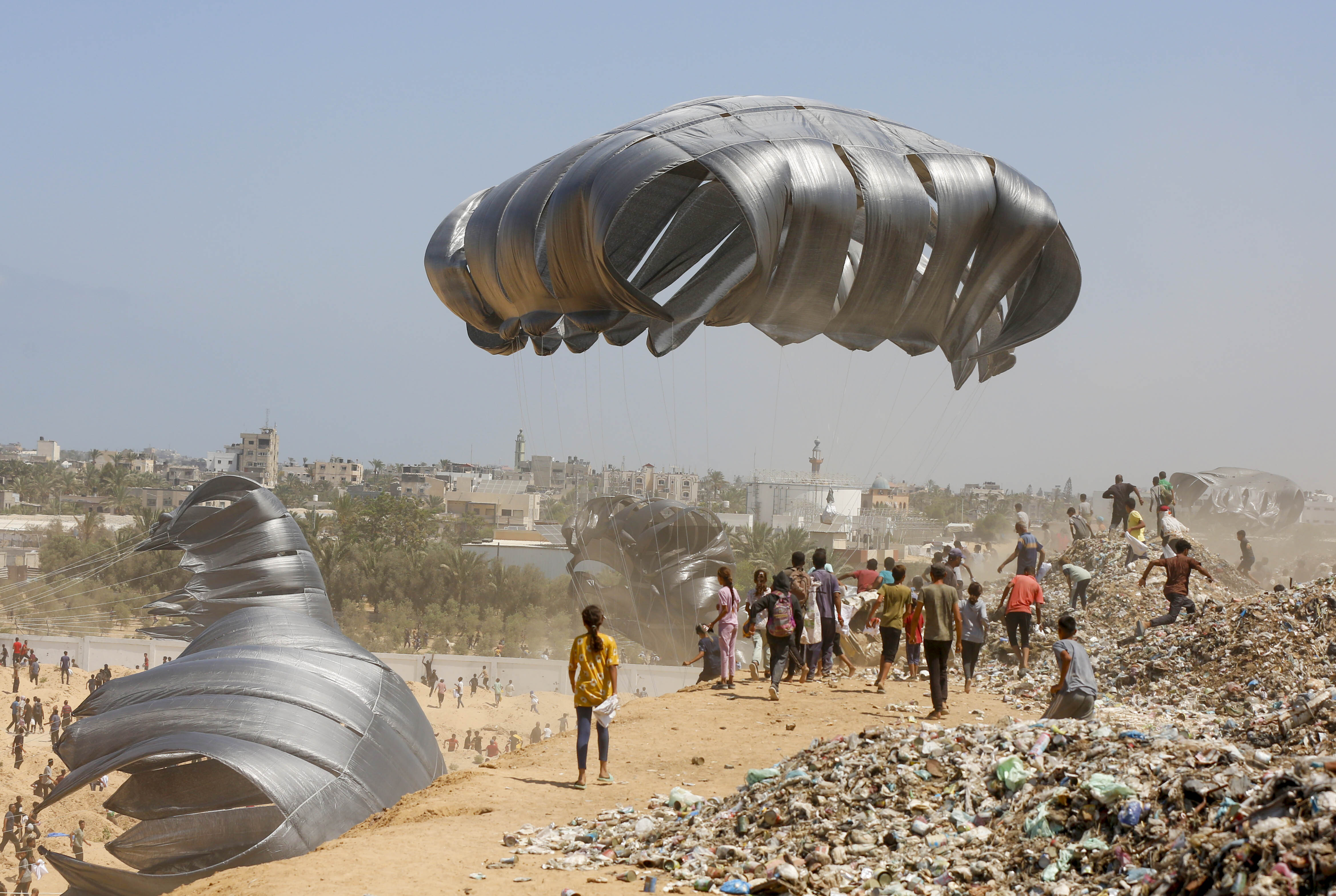 Humanitarian aid packages descending with parachutes over Deir al-Balah amid the ongoing Israeli strikes in Gaza on August 22, 2025. Attempts to drop humanitarian aid supplies by parachute from the air continue in the Gaza Strip, which is under attack and embargo by Israel. Planes dropped aid by parachute from the air to the city of Deir al-Balah, located in the central part of the Gaza Strip. Palestinians gathered in large numbers in the area to receive aid. (Photo by Mohammed Nassar/Anadolu via Getty Images)