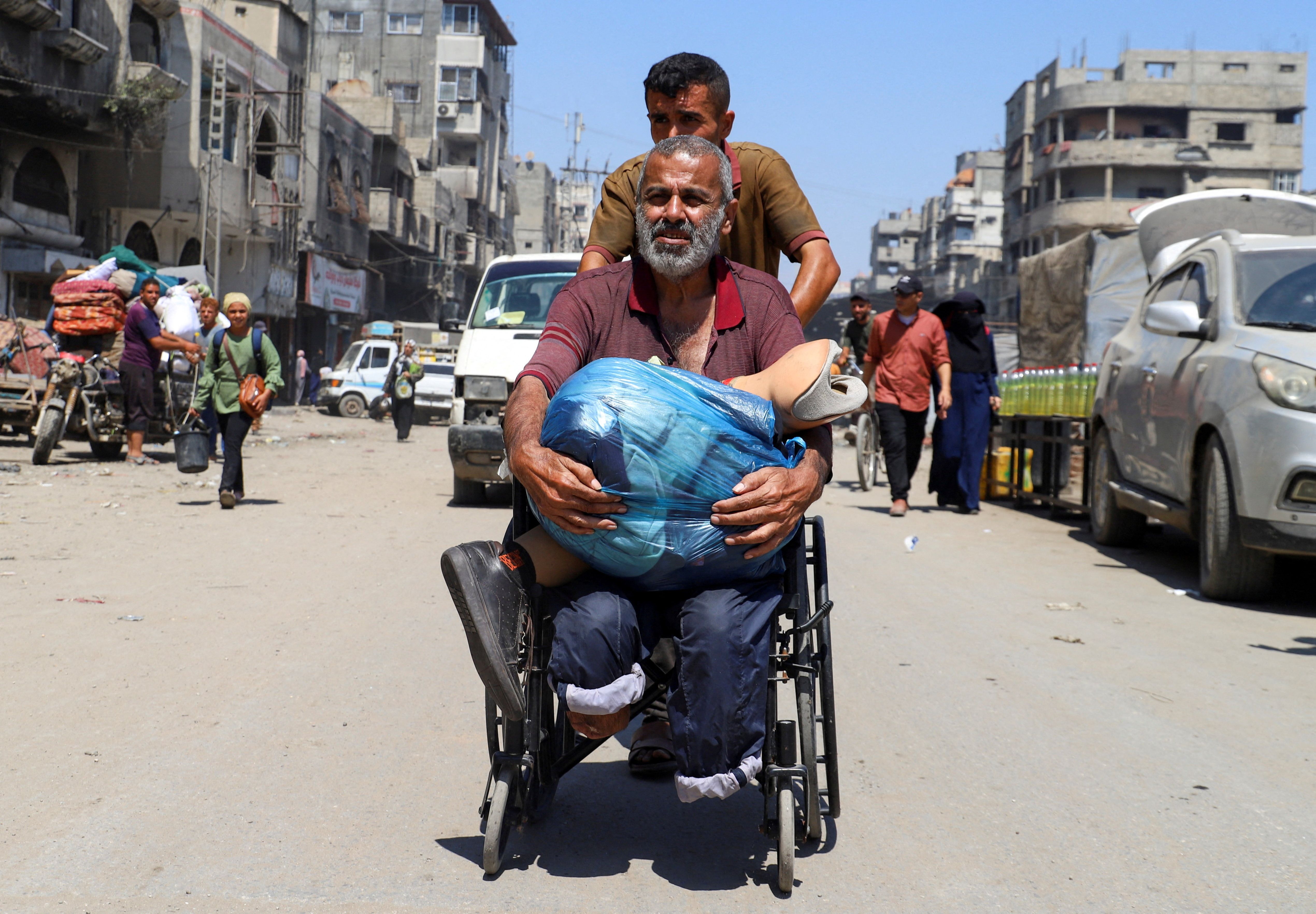 A displaced Palestinian man with amputated legs is pushed in a wheelchair as he holds his prosthetic limb while fleeing amid an Israeli military operation, in Gaza City, on August 26, 2025. (Photo by Ebrahim Hajjaj/Reuters)