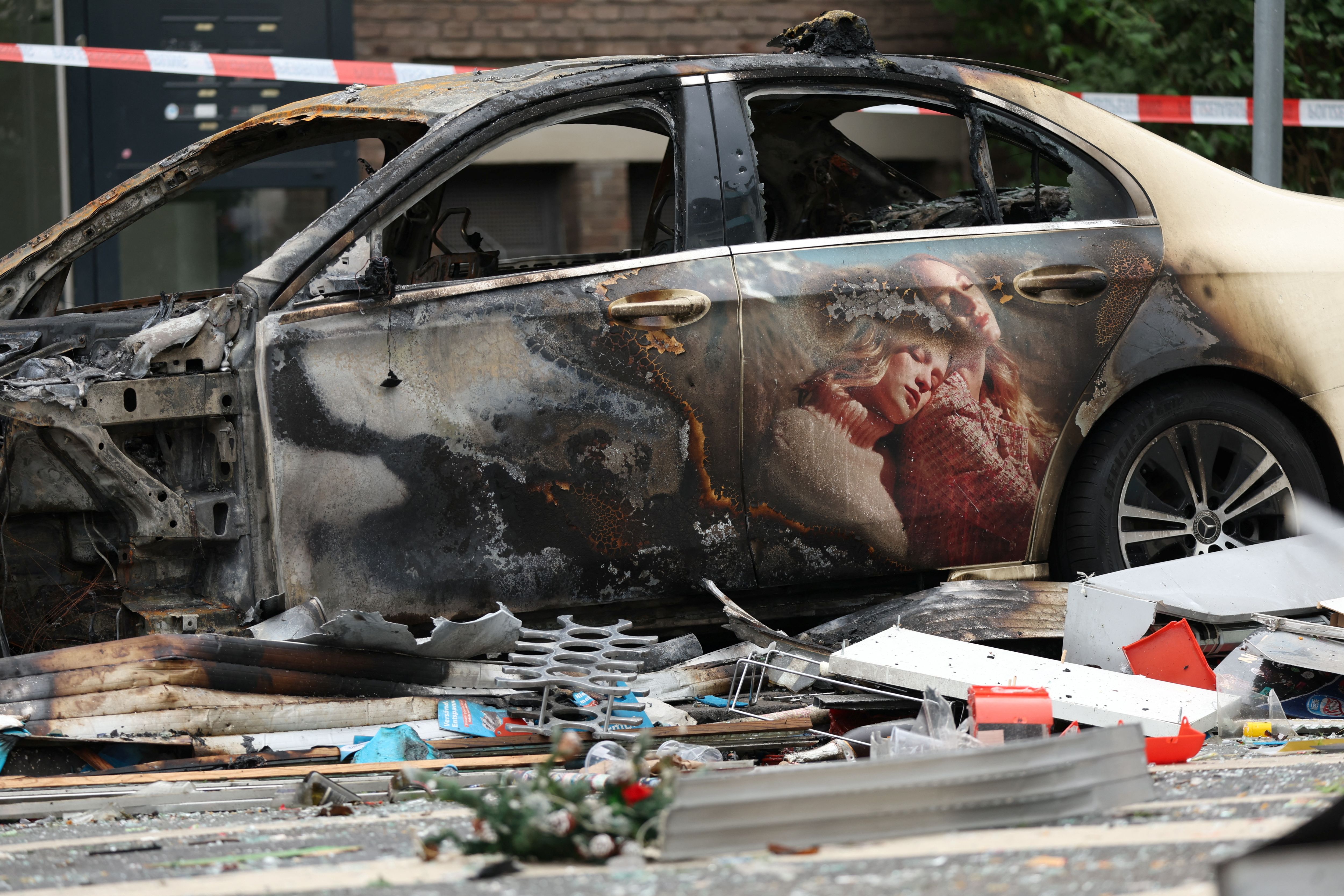 A damaged car near a building that was destroyed in an deadly overnight explosion in Düsseldorf, Germany on May 16, 2024. (Photo by Thilo Schmülgen/Reuters)