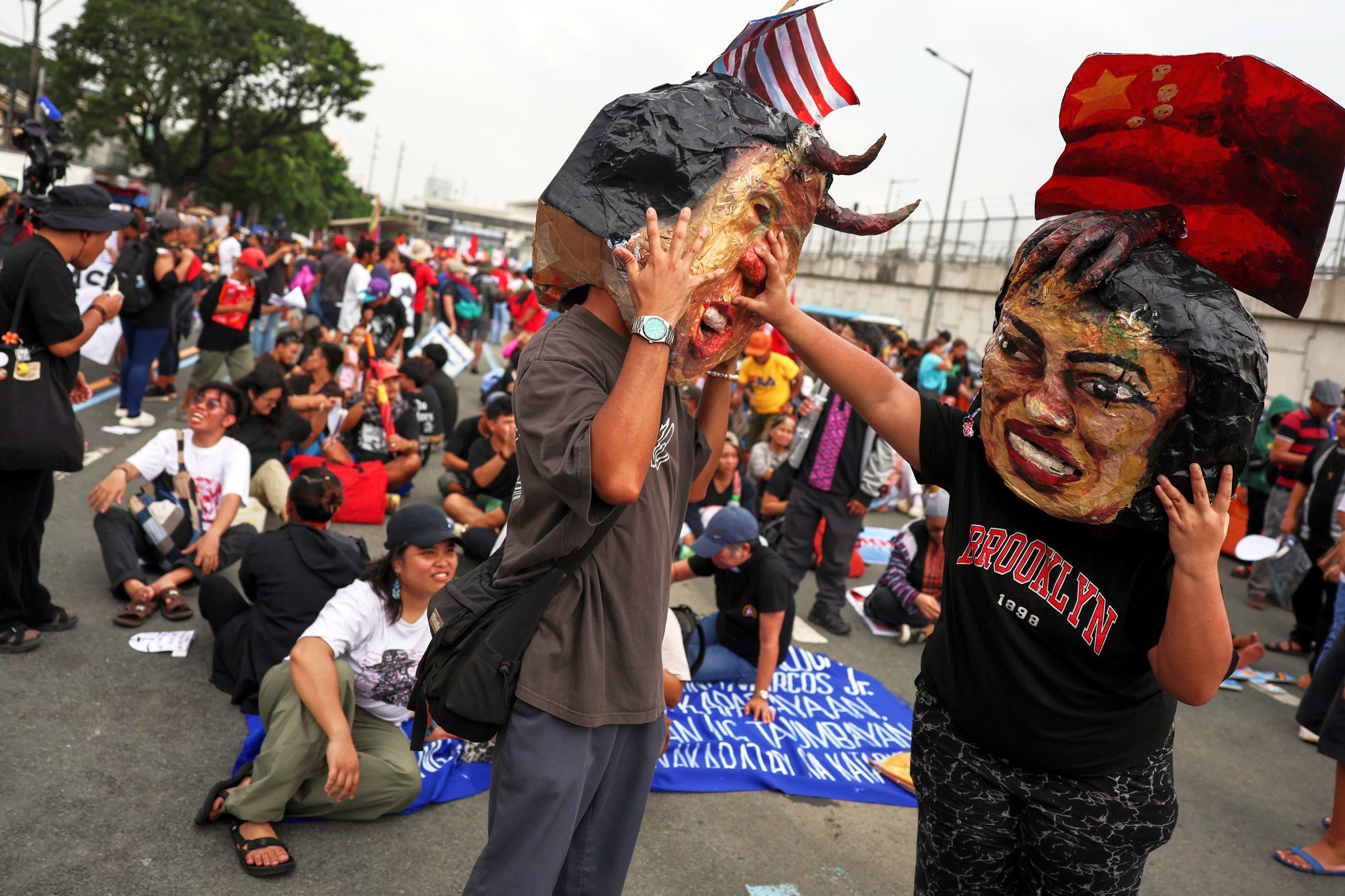 Protesters wear mock caricatures of Philippines Vice President Sara Duterte, right, and Philippine President Ferdinand Marcos Jr. during a rally in time for his State of the Nation Address in Quezon City, Philippines on Monday, July 28, 2025. (Photo by Basilio Sepe/AP Photo)