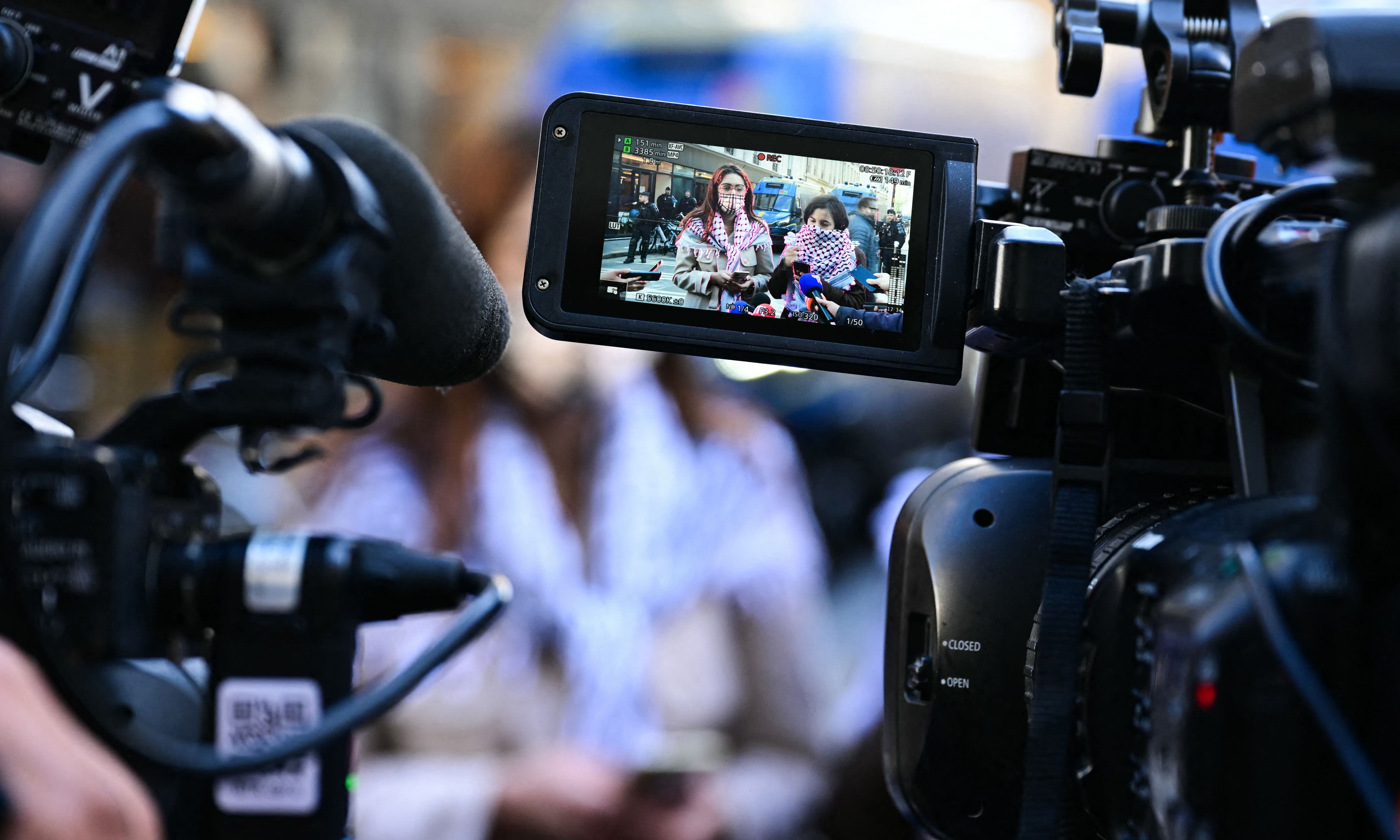 Members of Palestine Action Committee (Comite Action Palestine) answer journalists near the entrance of the Institute of Political Studies (Sciences Po Paris) occupied by students, to express their support for the Palestinians, in Paris on May 3, 2024. In an echo of tense demonstrations rocking many top US universities, students at Sciences Po in several cities have staged a number of protests, with some students furious over the Israel-Hamas war and ensuing humanitarian crisis in the besieged Palestinian territory of Gaza. (Photo by Miguel Medina/AFP Photo)