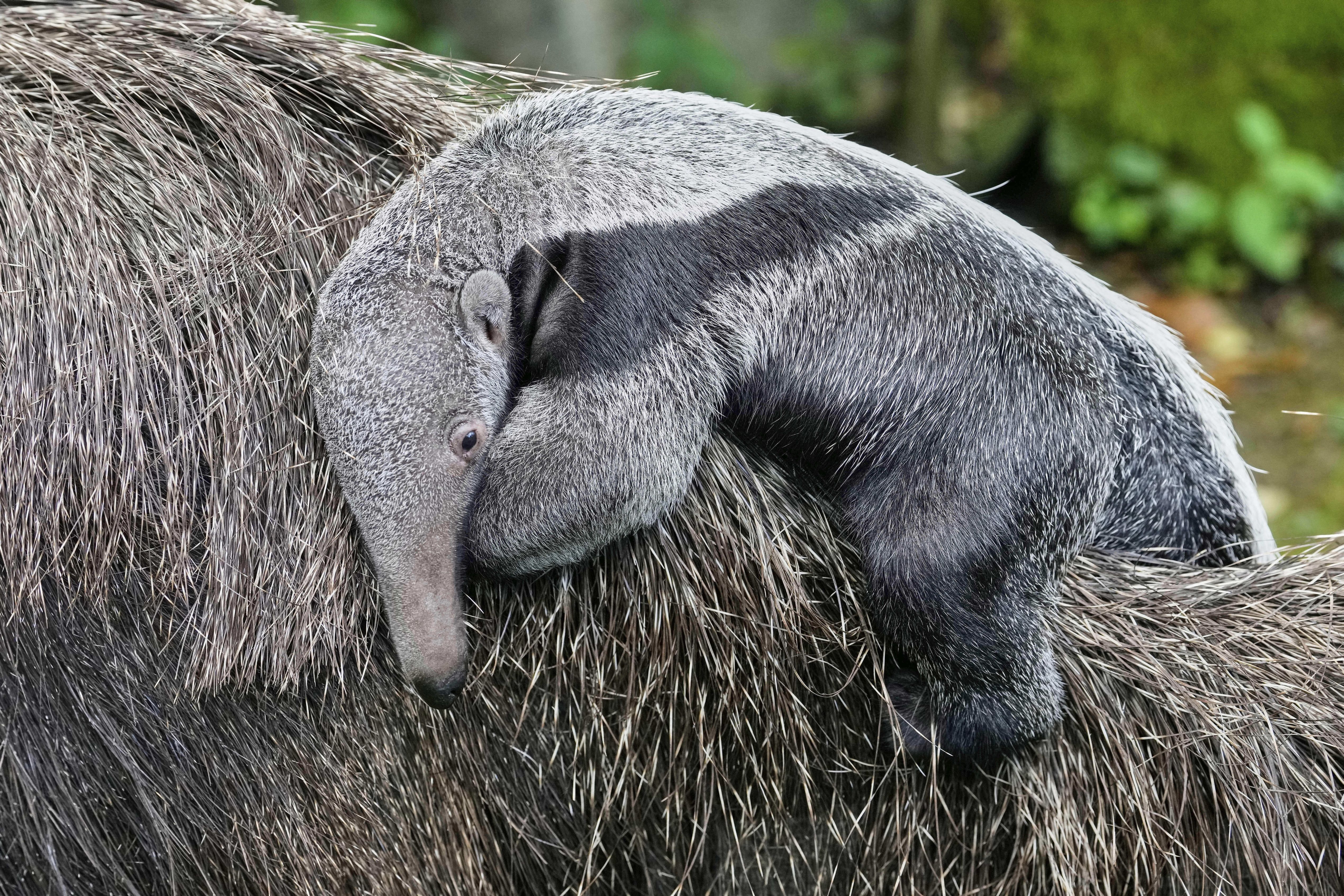 A two-week-old giant anteater cub rides on its mother's back at the zoo in Cologne, Germany, Thursday, September 11, 2025. (Photo by Martin Meissner/AP Photo)