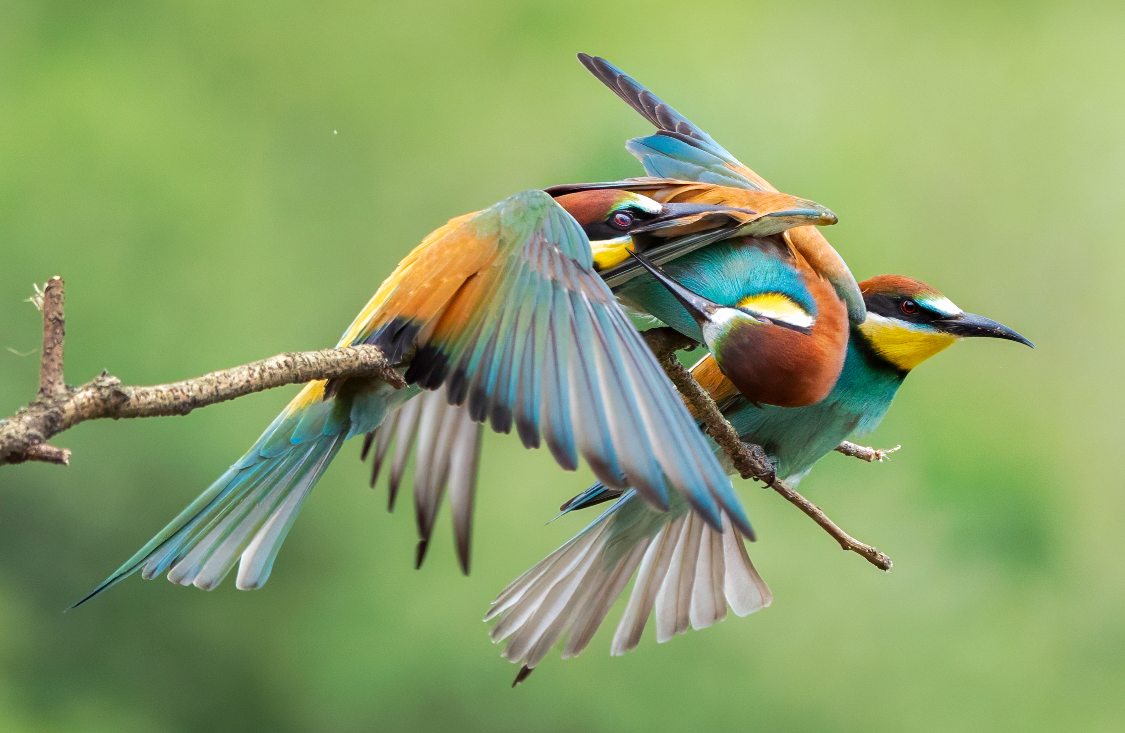 Two bee-eaters squabble over a perch in Malopolskie, Poland on September 10, 2025, as one tugs at the other’s wing in a jostle for the best hunting spot. (Photo by Przemysław Kacprzak/Solent News)